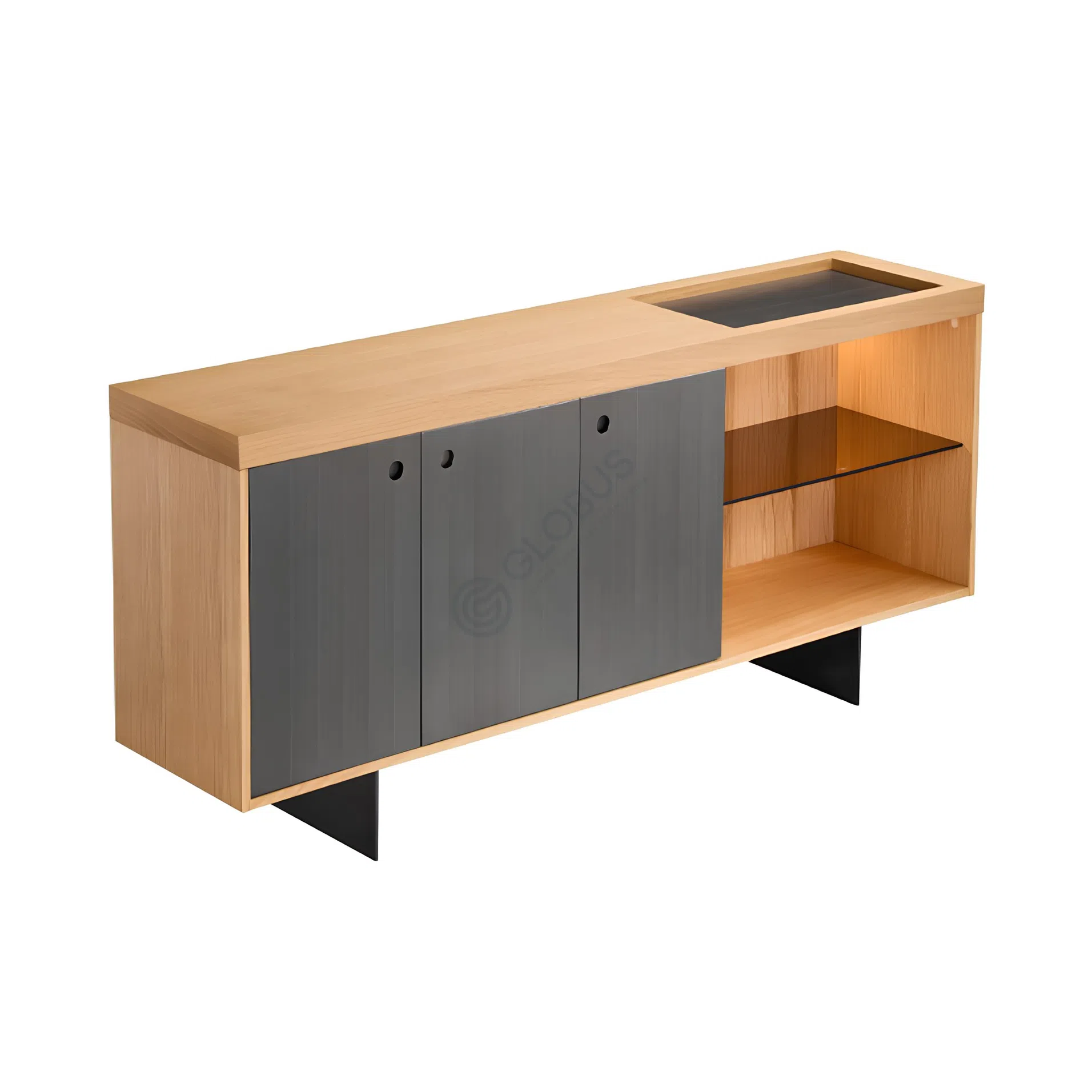 This piece offers a blend of open and concealed storage. It includes a section with two cabinet doors for discreet storage, paired with an open shelf area ideal for media components or display items. An integrated LED light strip subtly illuminates the open compartment, adding atmosphere. A contrasting glass panel is set into the top surface, providing a stylish and functional detail.