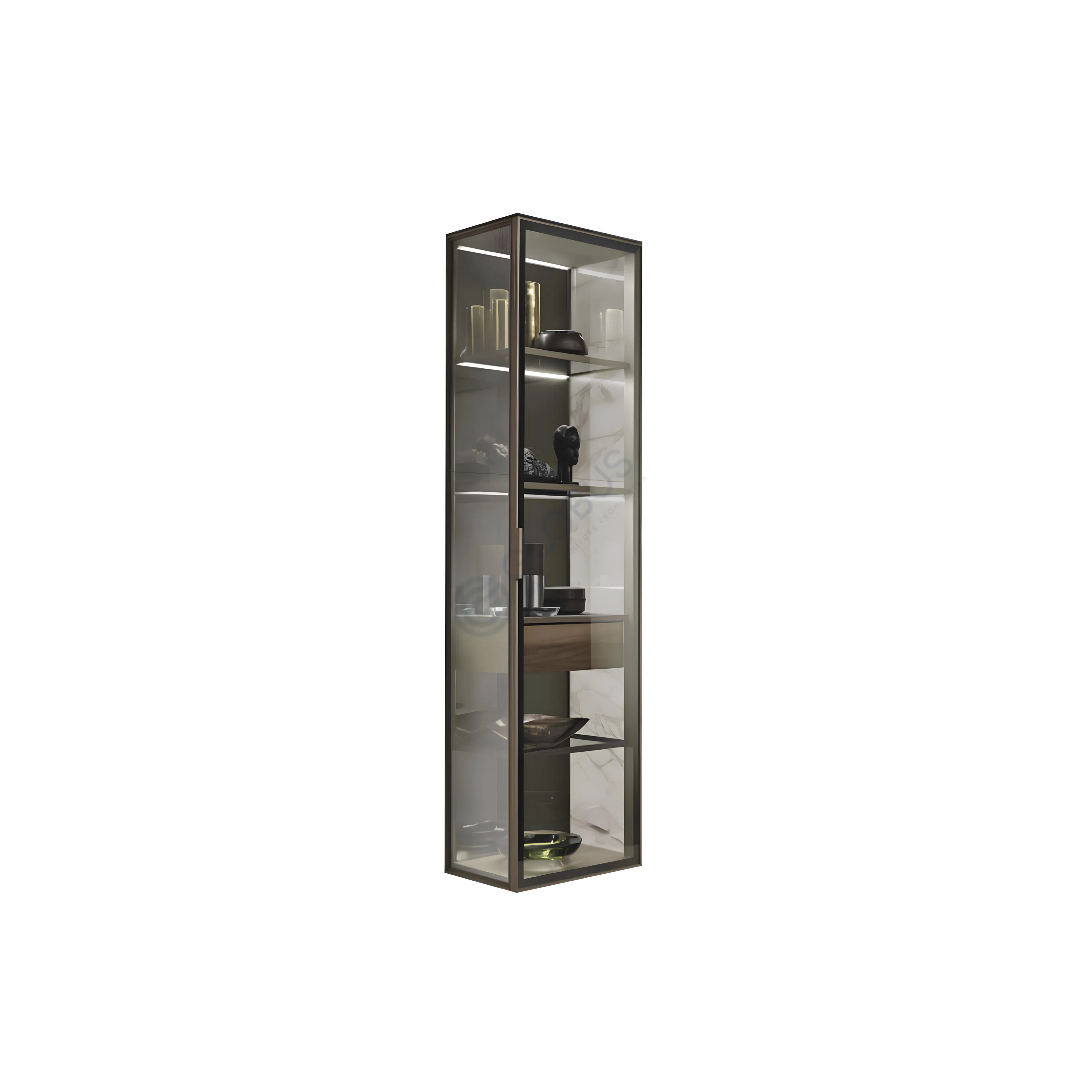Crafted with attention to detail, the cabinet features a combination of natural veneer, sturdy plywood, and sleek aluminum framing, ensuring both durability and visual appeal. Large panels of tempered glass provide clear visibility into the interior, allowing your displayed pieces to be admired.