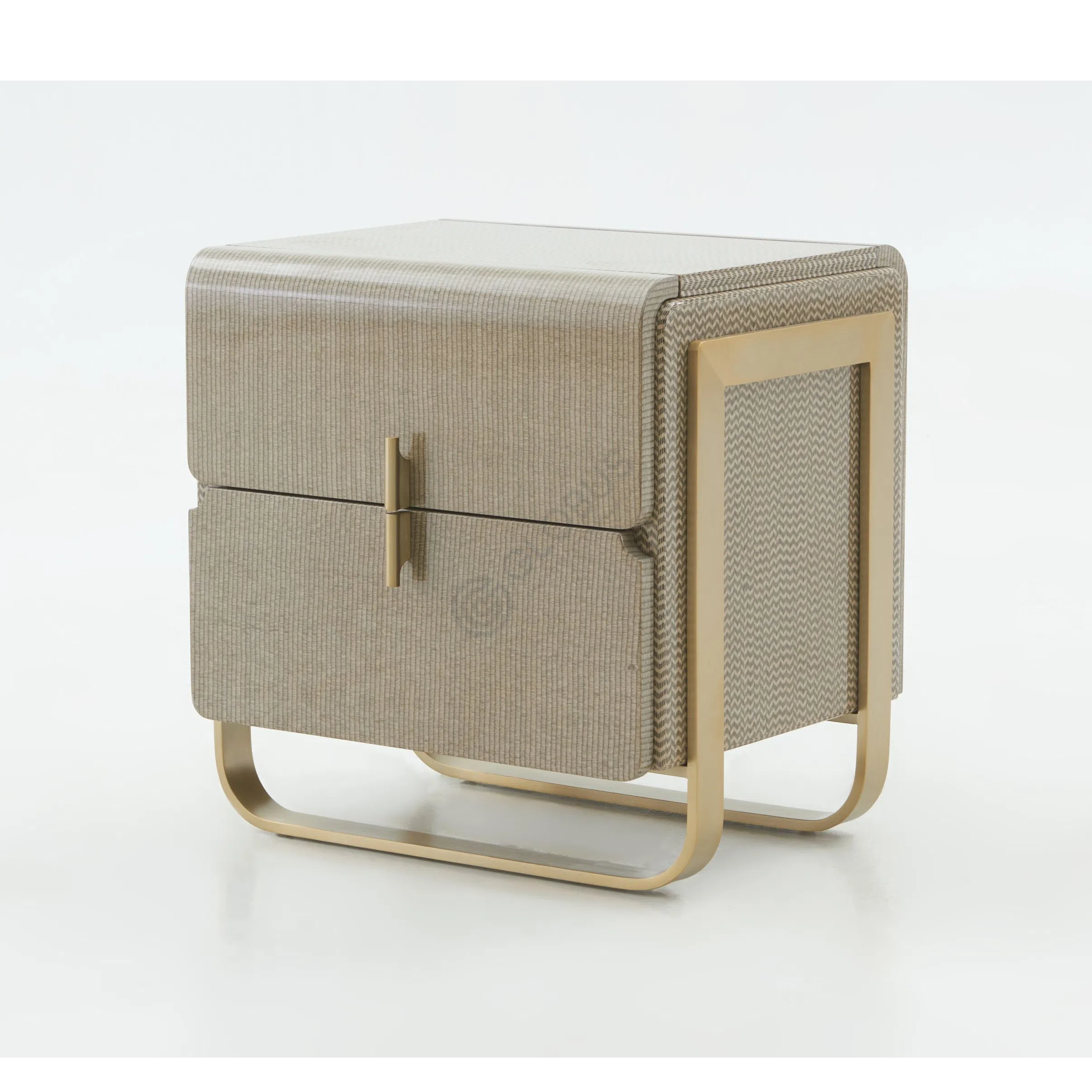 Complementing the bed, the accompanying nightstands echo its design language with matching upholstered tops and sleek bases, providing convenient surface space and completing the look.
