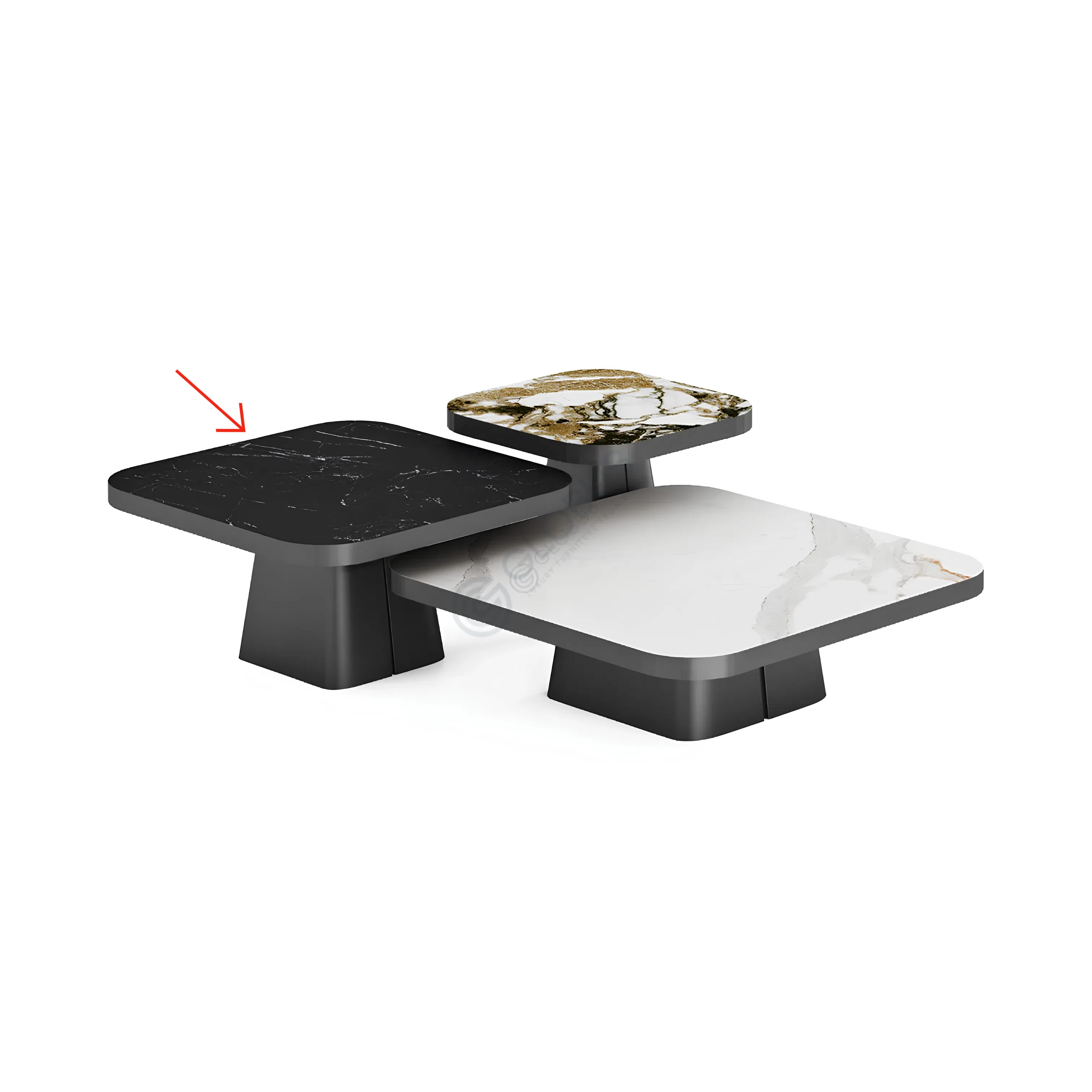 This modern side table offers a refined addition to any living room. Its exquisite top is crafted from sintered stone, showcasing a captivating pattern of white, gold, and grey veins that evoke the timeless beauty of natural marble. The smooth, rounded corners of the tabletop soften its contemporary silhouette.