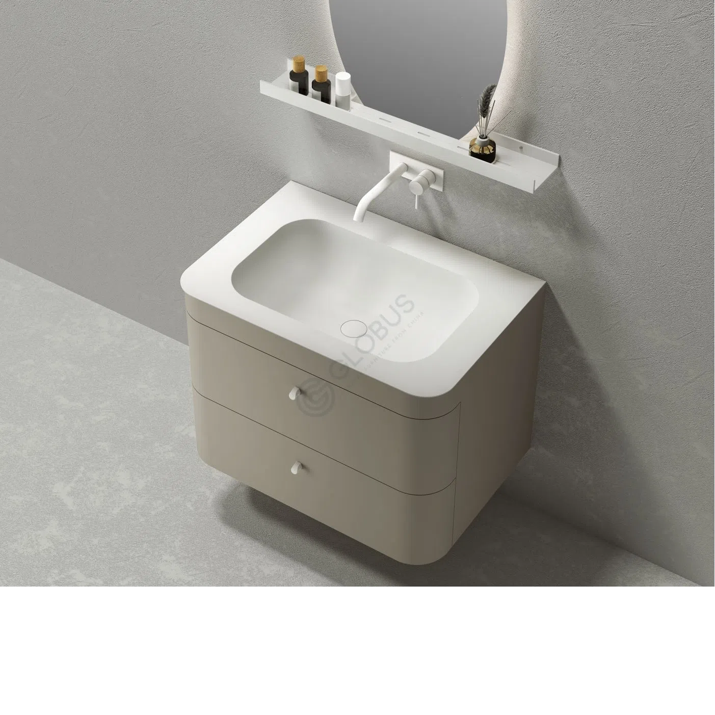 The piece features a beautiful oval mirror, softly illuminated from behind, creating a gentle ambient light perfect for daily routines. Below the mirror sits a slim, integrated shelf. Crafted with quality plywood for structure, this shelf provides a clean, stable surface.