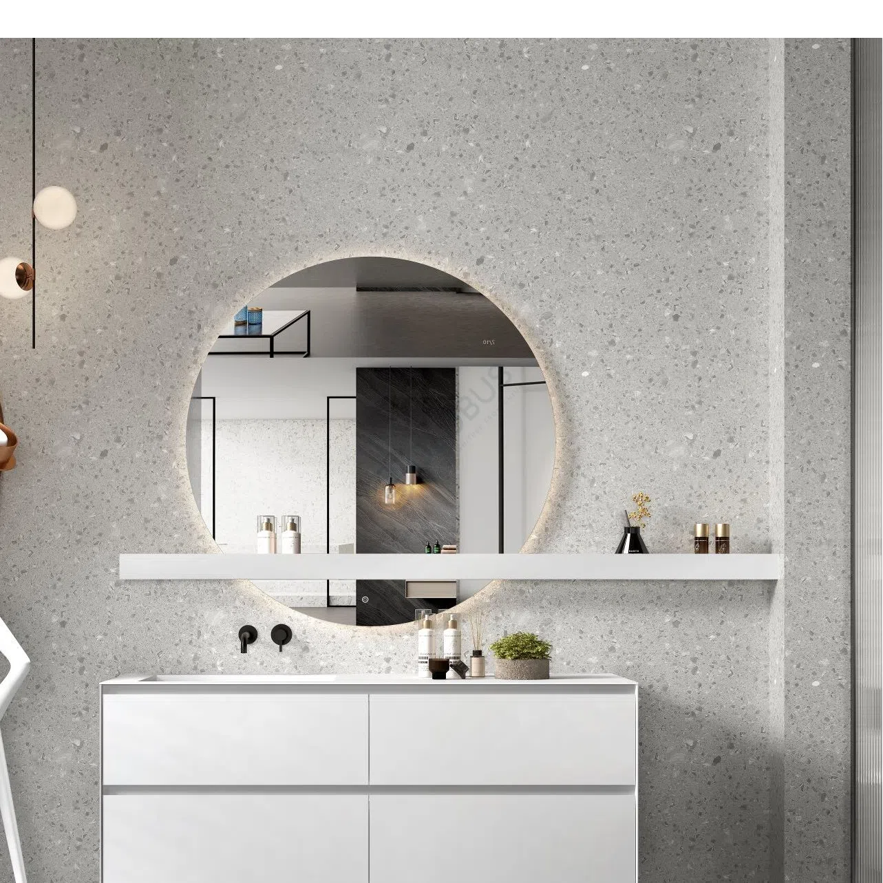 This modern bathroom cabinet offers a sleek and minimalist aesthetic, designed to enhance a contemporary space. Its clean white finish and rectangular form create a sense of calm and order. The floating installation provides a visually light appearance, contributing to an open and uncluttered feel in the bathroom.