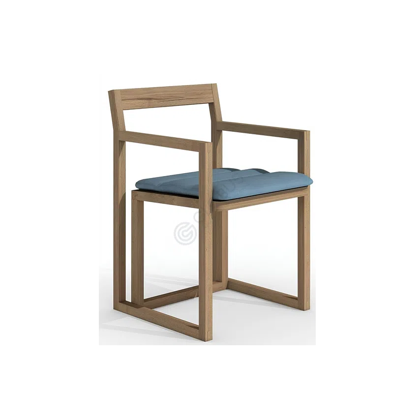 An armchair crafted from solid wood presents a striking modern design. Its clean lines form a geometric structure, creating an open and airy feel. The natural wood grain is visible, adding warmth and an organic touch to its contemporary form. A soft textile cushion rests on the seat, providing a contrasting element of comfort against the solid frame.