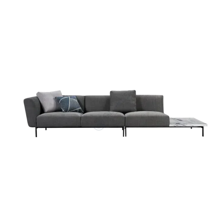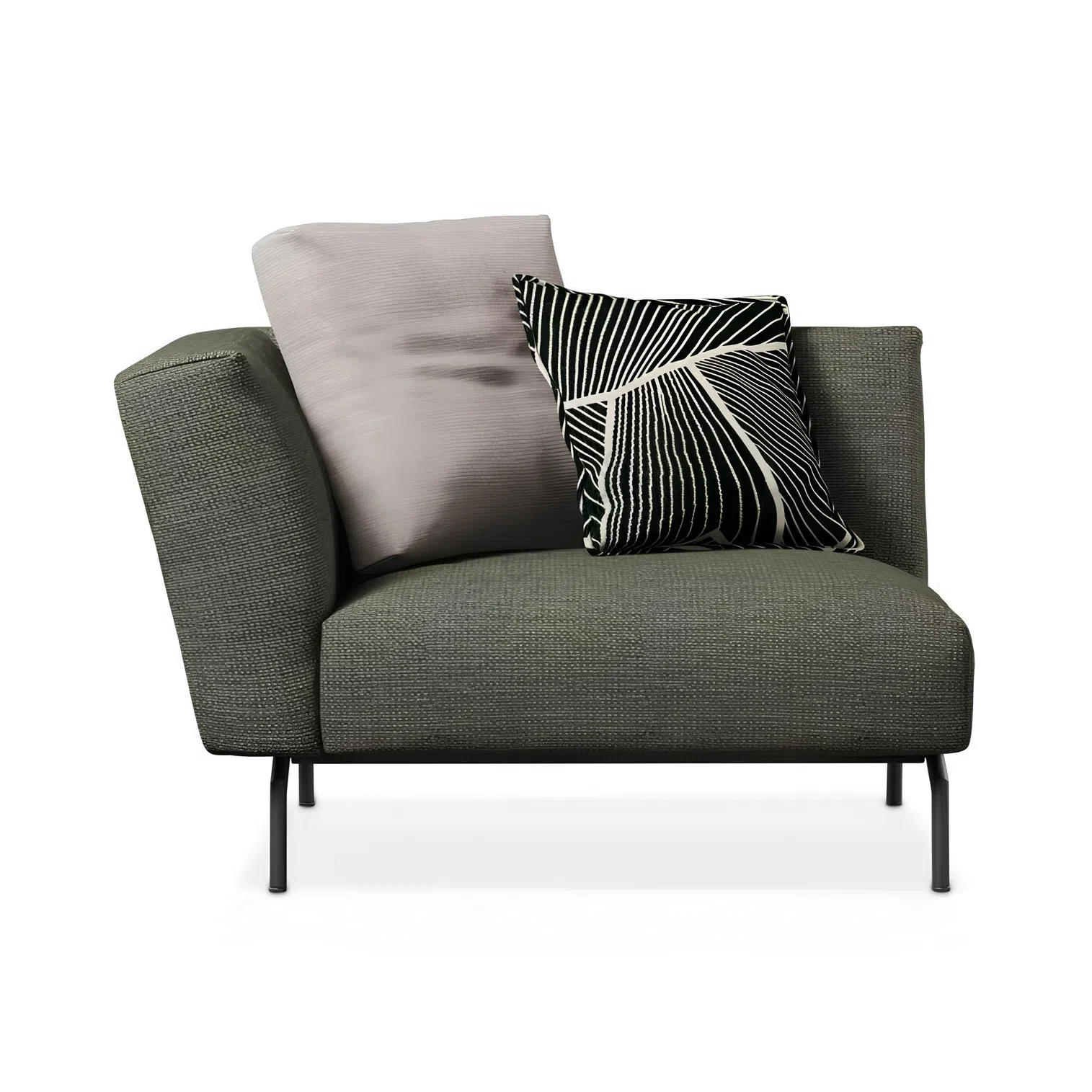 Discover a modern armchair designed with clean lines and a distinctive profile. Its asymmetrical shape and low back offer a contemporary feel, creating a piece that is both stylish and inviting. The included back cushion provides additional support and comfort.