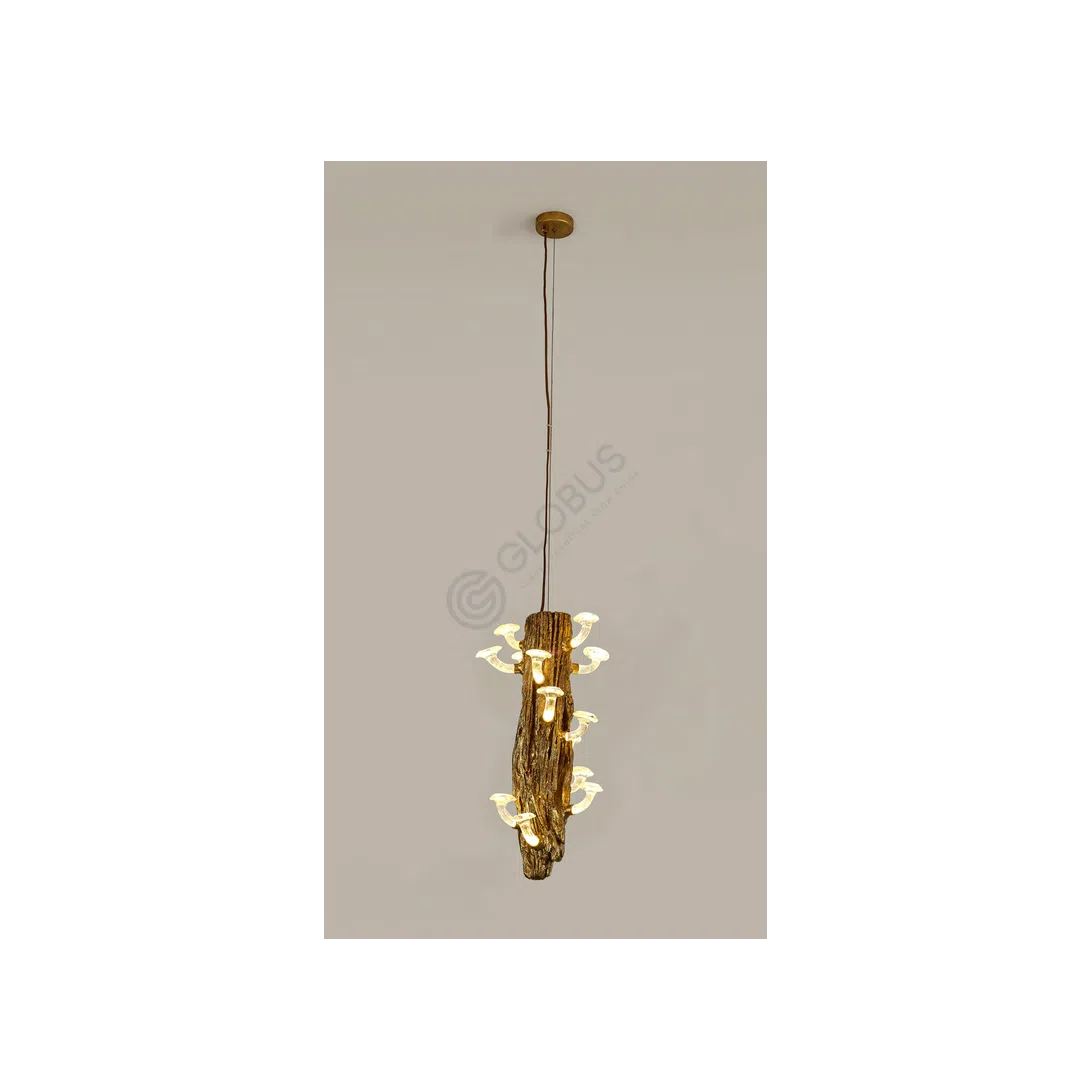 A striking pendant light features an artistic, branch-like structure crafted from aluminum. Adorning this organic form are multiple delicate elements made of glass, resembling illuminated fungi or sparkling crystals. This combination creates a captivating visual display, merging natural inspiration with sophisticated design and refined materials.
