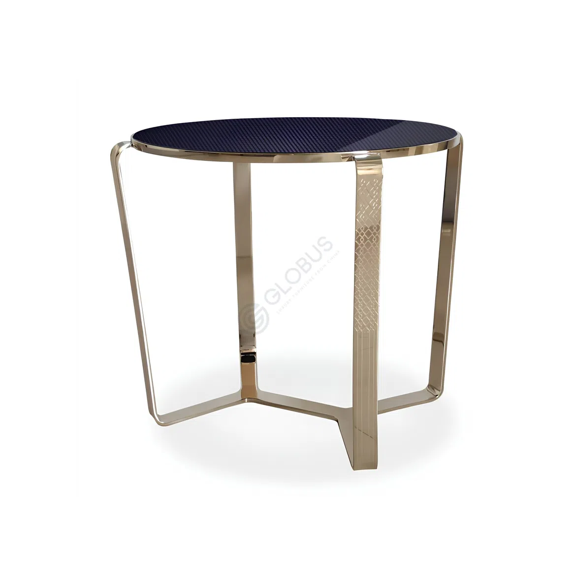 The round top softens the geometric lines of the base, creating a harmonious balance. The metallic finish of the legs catches the light, adding a subtle touch of luxury. One leg features a subtle textured detail, adding an interesting element to the overall design.