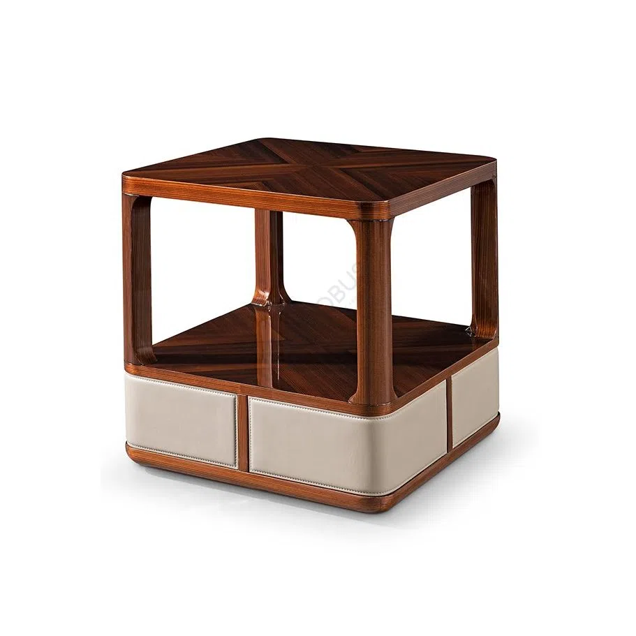 The structure below the marble top is crafted from a combination of solid wood and durable plywood, providing stability and a warm base tone. Subtle panels on the sides, potentially finished in microfiber leather, add a refined textural contrast and visual interest.