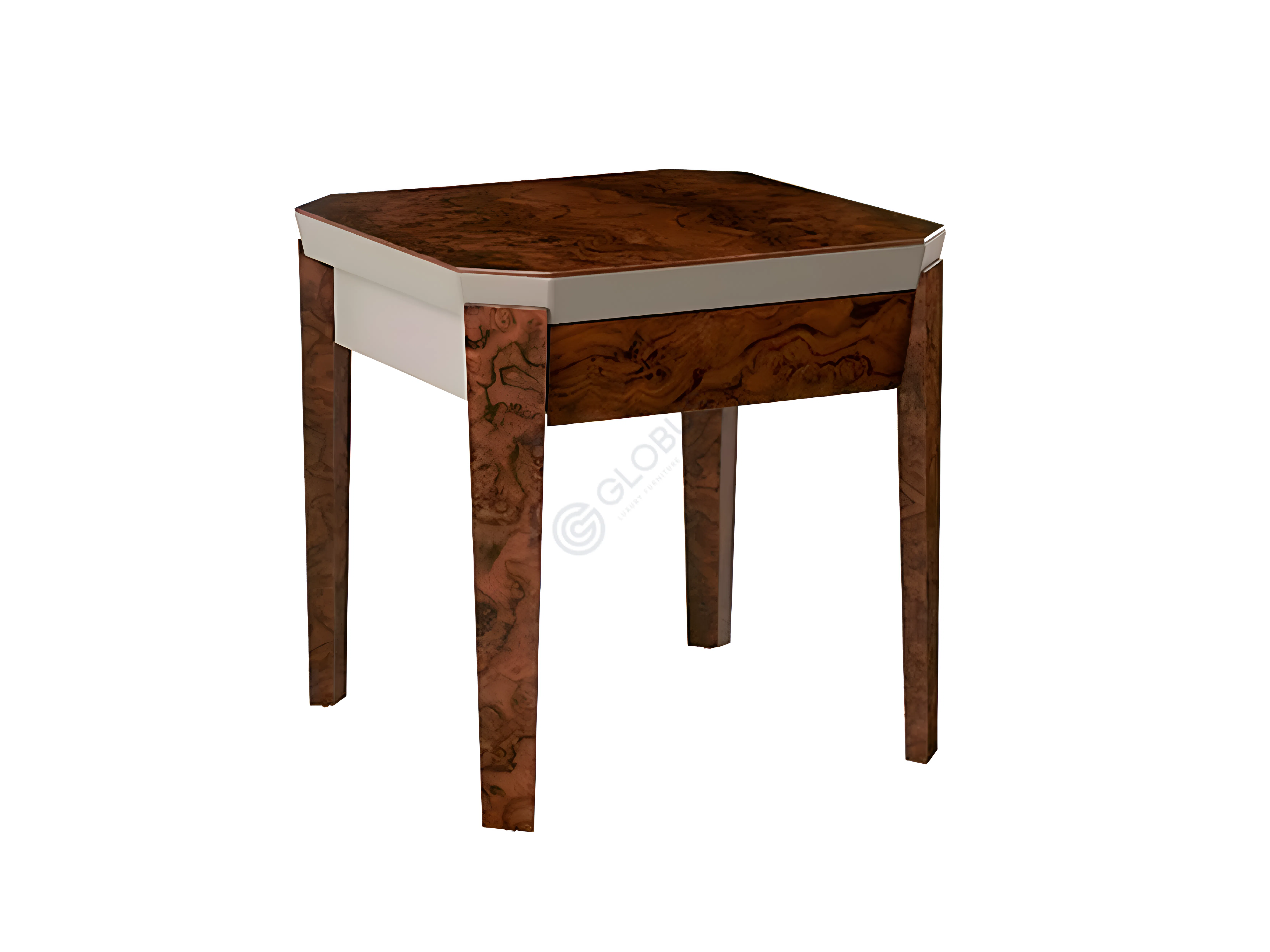 This modern side table features a distinctive octagonal top with precisely chamfered corners, presenting a refined surface. The tabletop is finished with a rich natural veneer that displays a beautiful, intricate pattern, providing visual interest and warmth. A clean apron detail, wrapped in smooth microfiber leather, offers a subtle contrast and complements the wood tones.