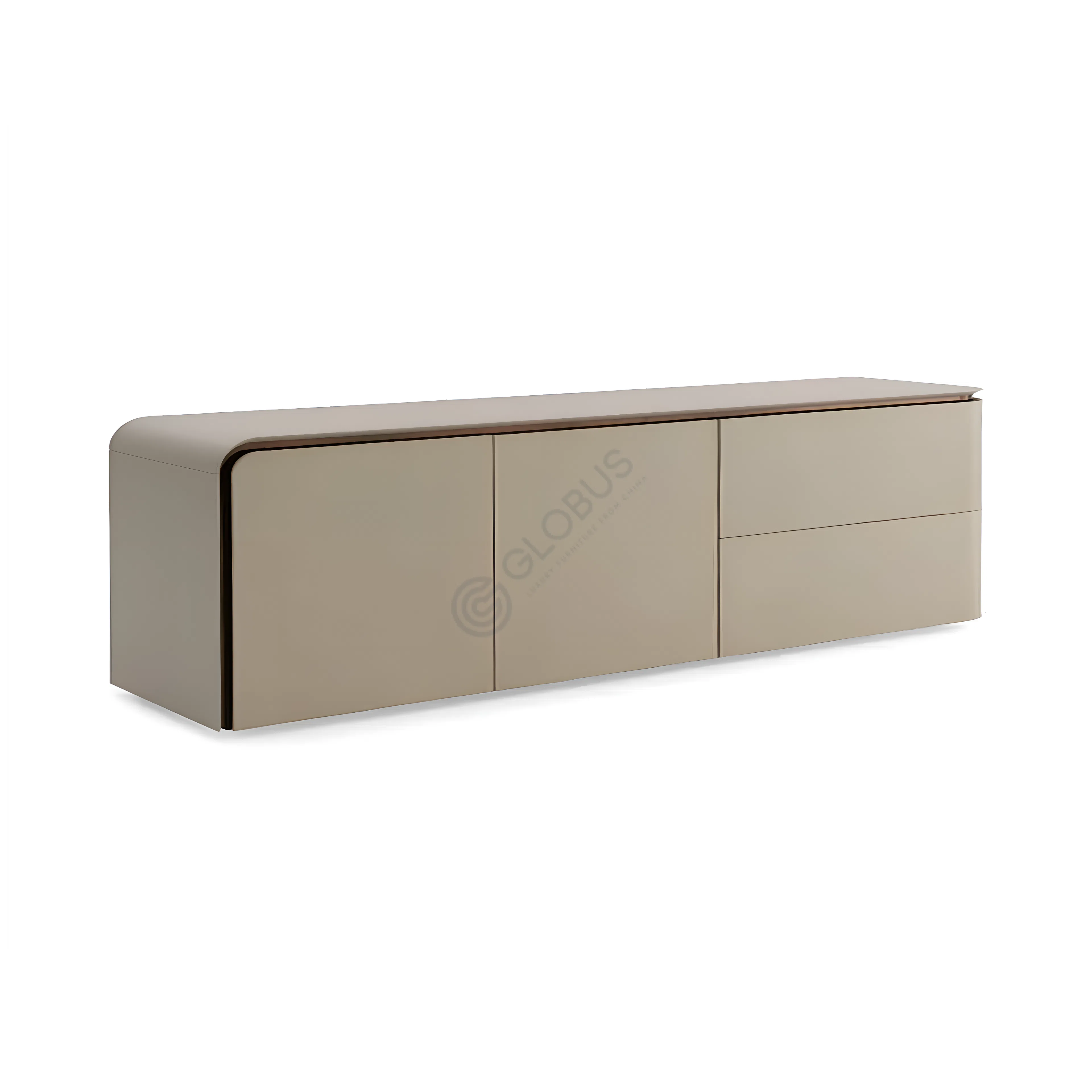 The piece is constructed with a solid wood framework, ensuring stability and lasting quality. Its drawer fronts are expertly finished in smooth microfiber leather, providing a soft texture and refined look. Subtle metal accents are integrated into the design, adding a touch of contemporary elegance.