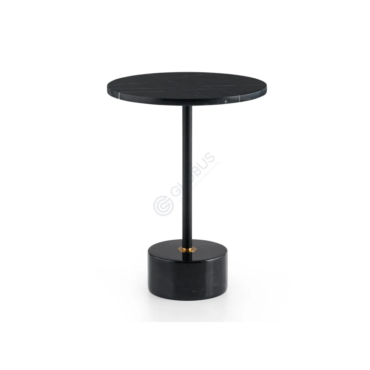 The table features a substantial cylindrical base expertly crafted from natural marble. The inherent beauty of the stone is showcased through its unique veining and rich dark tones, providing a solid foundation and an element of natural elegance.