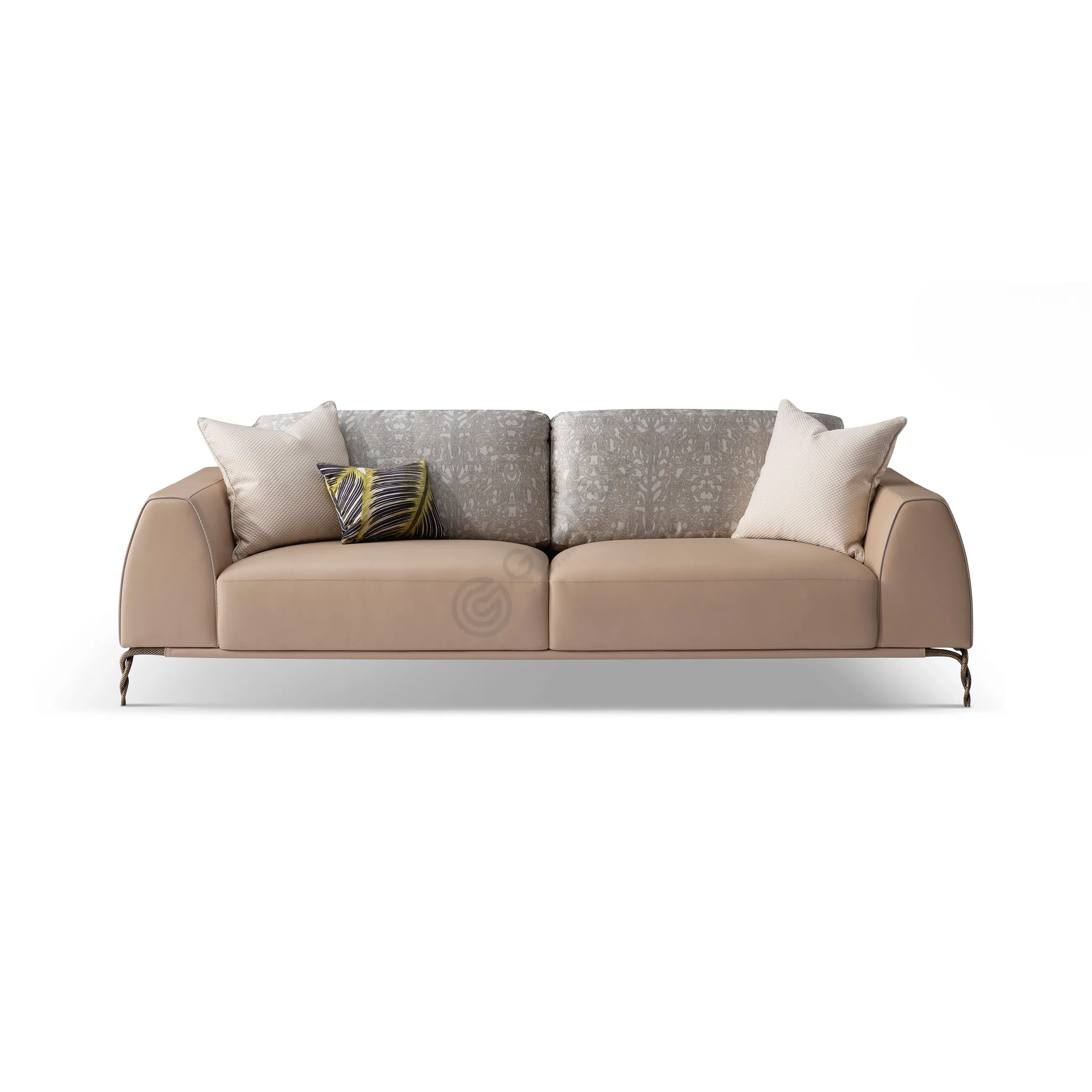 Crafted with a blend of high-quality materials, the frame incorporates solid wood and plywood for enduring stability. Sleek metal legs provide elevated support, contributing to the sofa's refined profile. The seating surfaces feature a sophisticated combination of textile, potentially incorporating microfiber leather or leather accents, offering both tactile appeal and comfort.