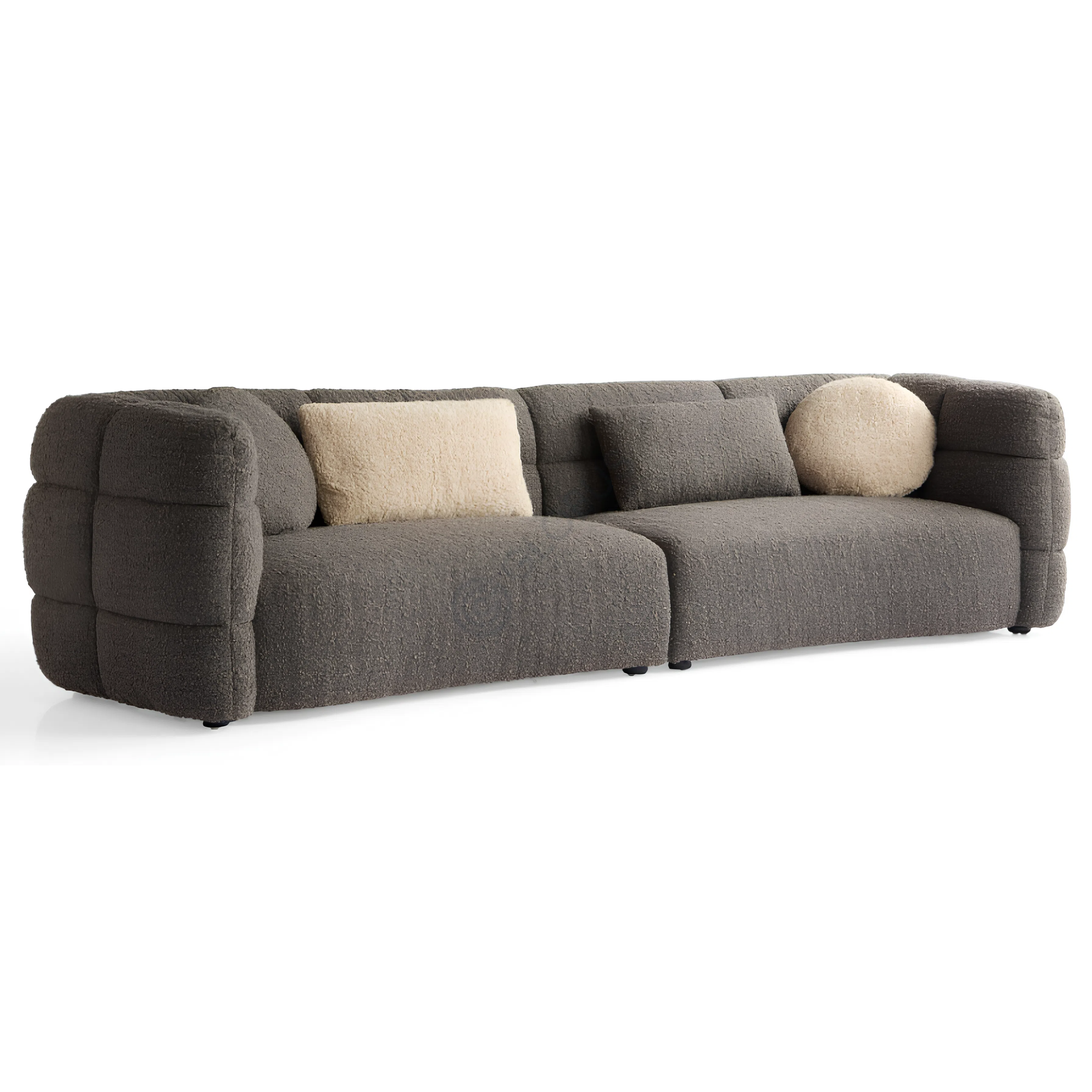 This armchair presents a unique, soft silhouette that invites relaxation. Its generous form is defined by plush, rounded segments covered in a luxurious textile, offering a gentle visual texture and a soothing presence. The subtle colour complements various interior palettes, making it a versatile focal point in a living area.