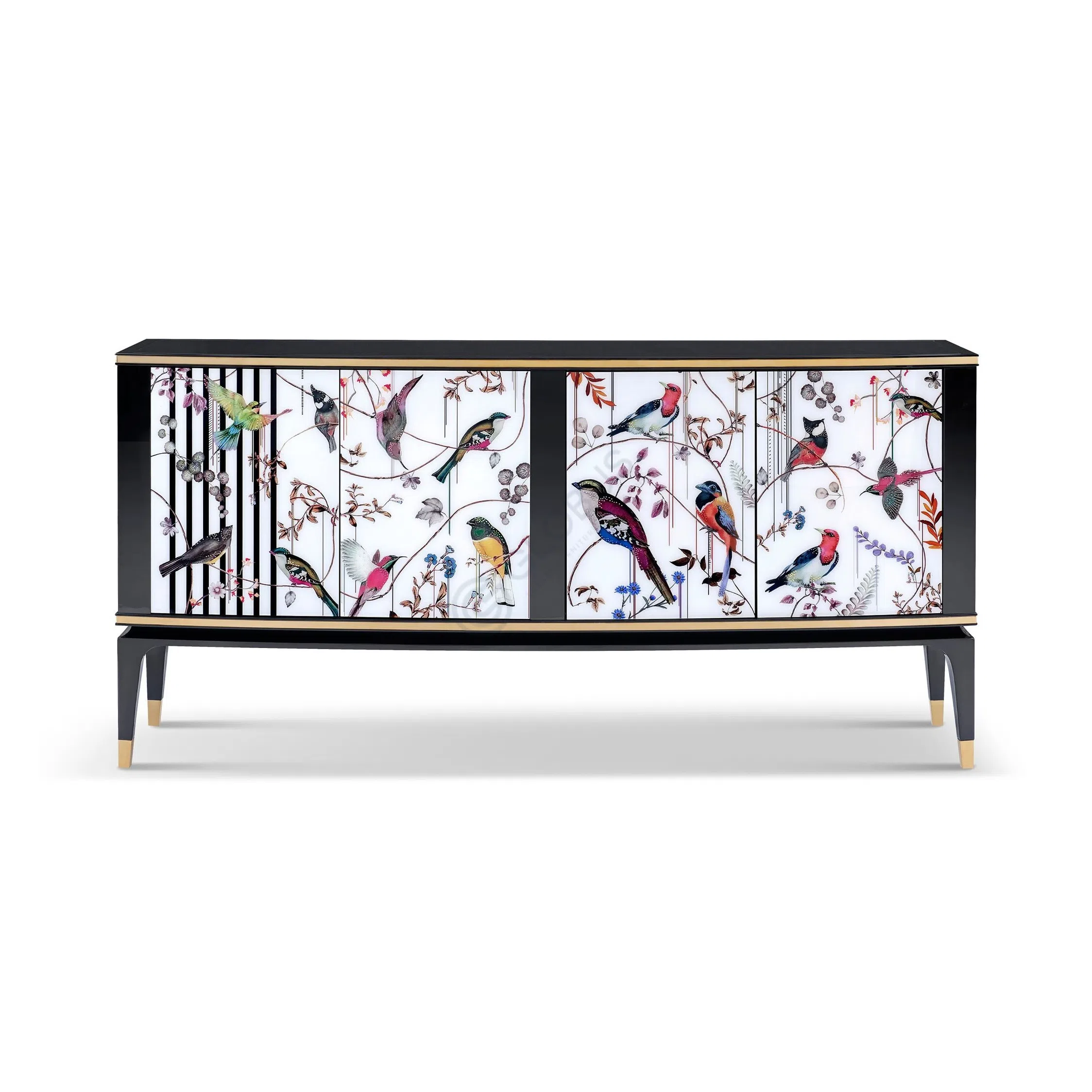 Discover a wine cabinet that combines elegance and functionality. Crafted from solid wood, metal, glass, and mirror, this piece offers a stunning display for your wine collection. The intricate bird and floral design adds a touch of nature-inspired beauty, making it a standout addition to any room. With its sleek lines and refined materials, this cabinet not only stores your wine but also enhances your home decor. Perfect for those who appreciate both style and practicality.
