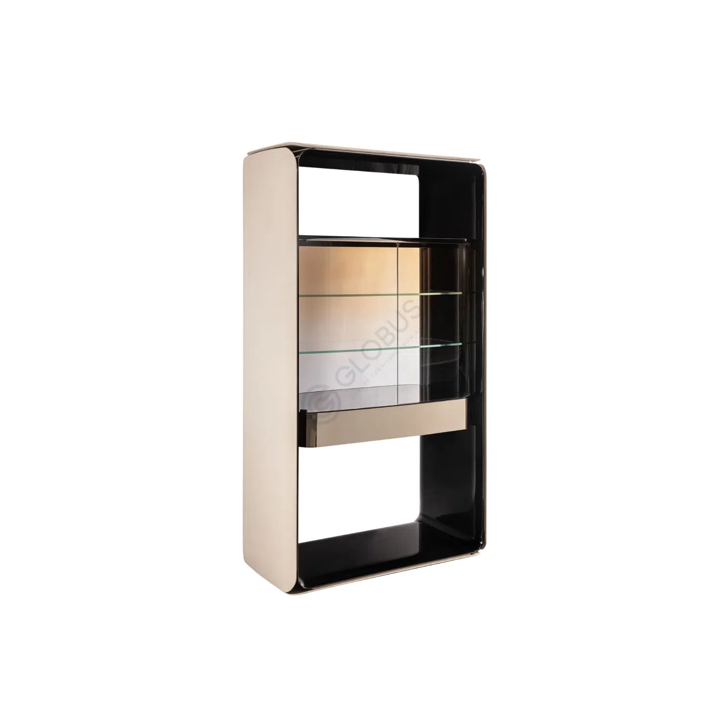 Integrated into the design is a central storage compartment visible through curved glass doors. Inside, glass shelves offer practical space for media devices or display items, keeping them organized yet accessible. The open sections on either side of this central unit provide additional space, maintaining the stand's minimalist aesthetic while offering convenient storage or display opportunities.