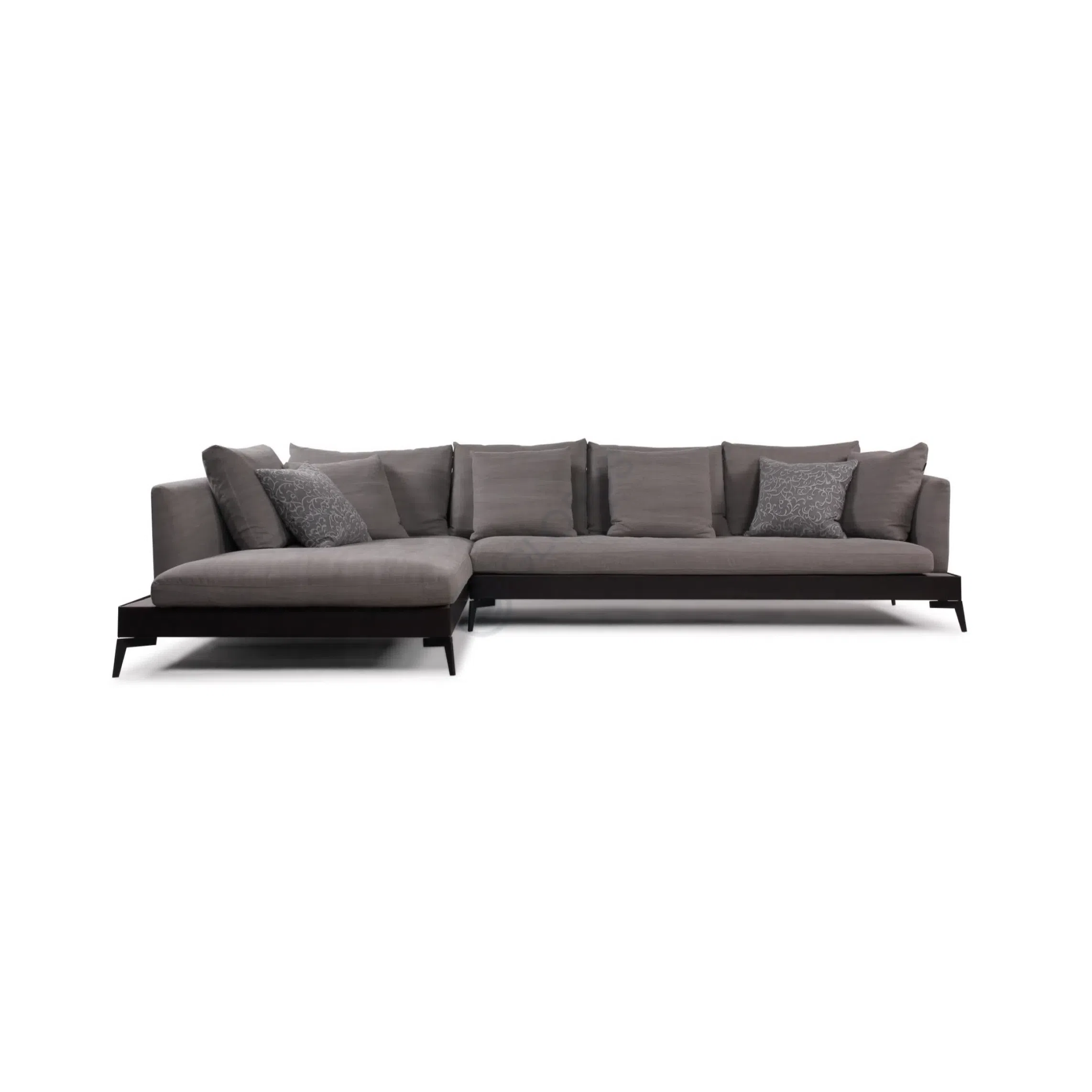 The frame is constructed from solid wood and plywood, ensuring longevity and stability, while the plush seat and back are wrapped in a premium textile that provides comfort and a polished look. The warm tones of the upholstery are perfectly complemented by the dark, minimalist wooden legs, creating a balanced and inviting aesthetic.