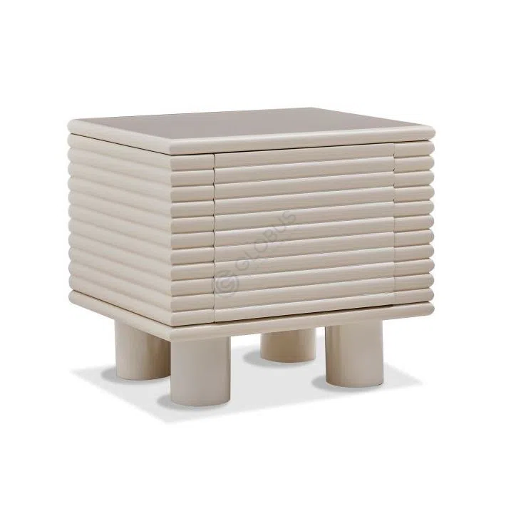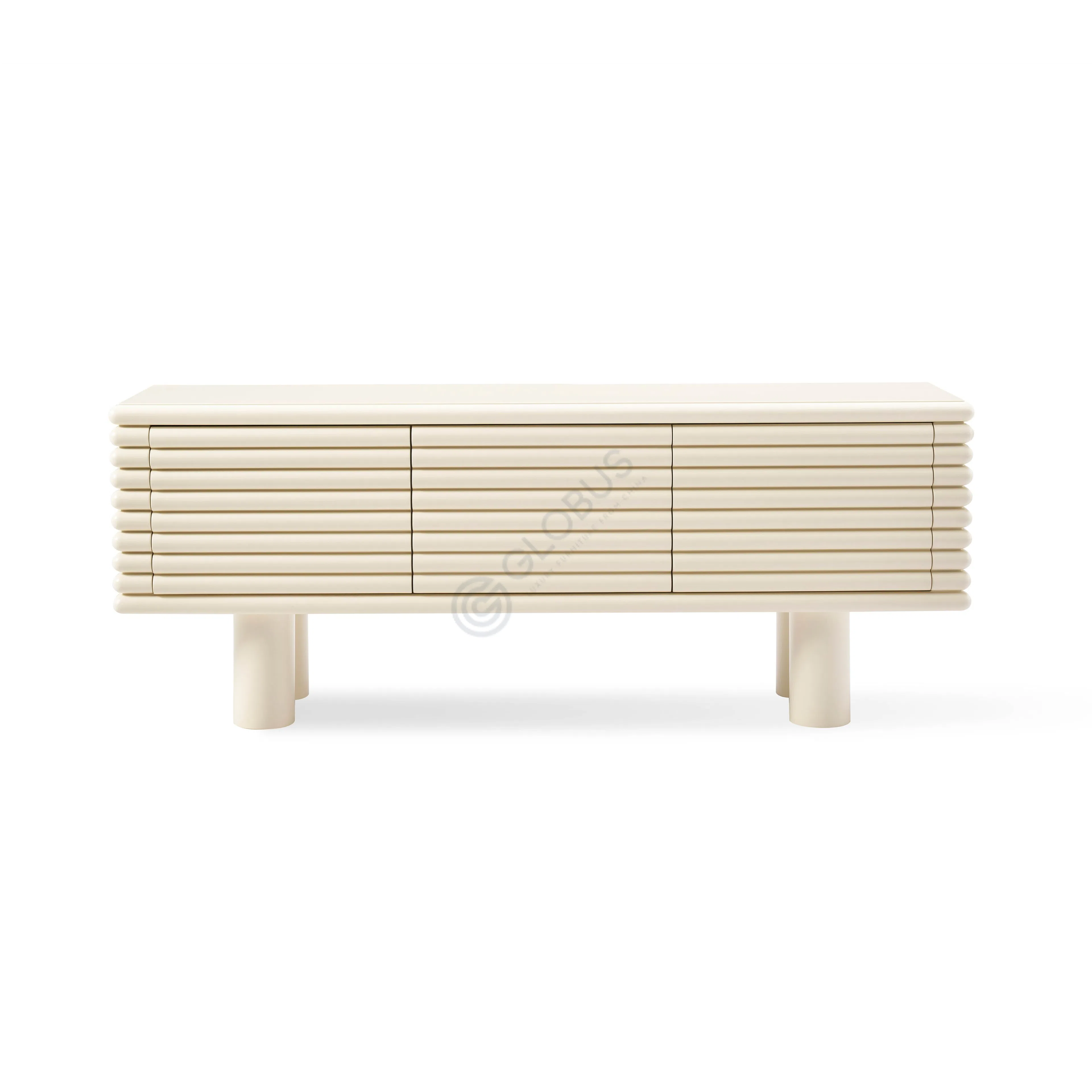 This modern TV stand combines a low-profile silhouette with subtle textures for a refined presence in any living room or bedroom. The slatted front panel wraps around a sturdy MDF frame, while leather-trimmed edges introduce a warm, tactile contrast. Cylindrical legs lift the unit off the floor, creating a sense of lightness and making floor cleaning effortless.