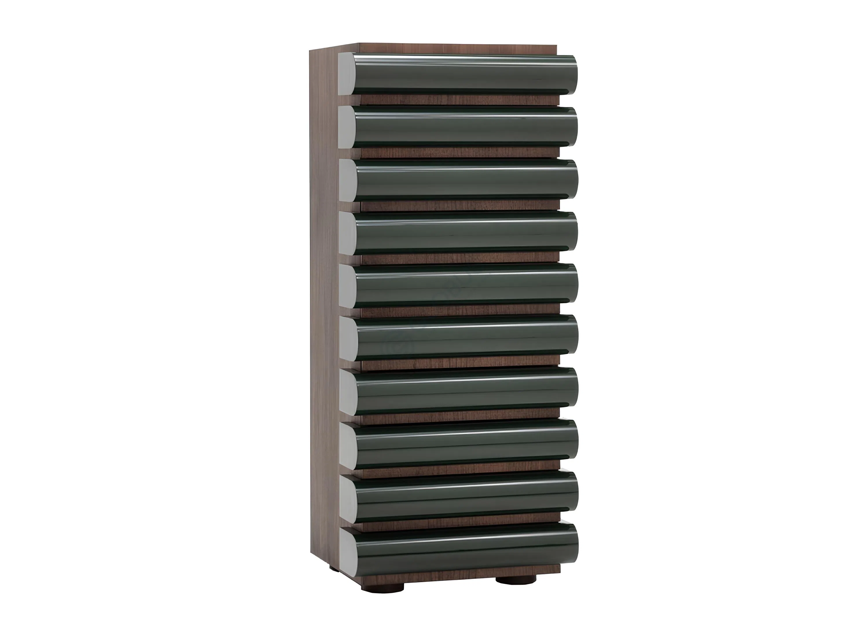 This modern bedside table brings a bold and sophisticated presence to the bedroom. The design features a series of layered, horizontal panels in deep burgundy and matte black, creating a striking balance between color and texture. Its clean, geometric form highlights the modern style, while the stacked appearance adds visual depth and interest.