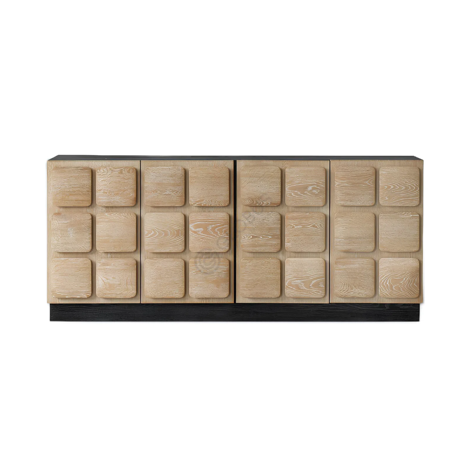 The distinctive front showcases four subtly raised panels, each revealing the rich texture and unique grain of the light wood veneer. This organic detail finds an elegant counterpoint in the deeper, dark finish that frames its form, adorning the sides, top, and recessed base, imparting a sophisticated depth.