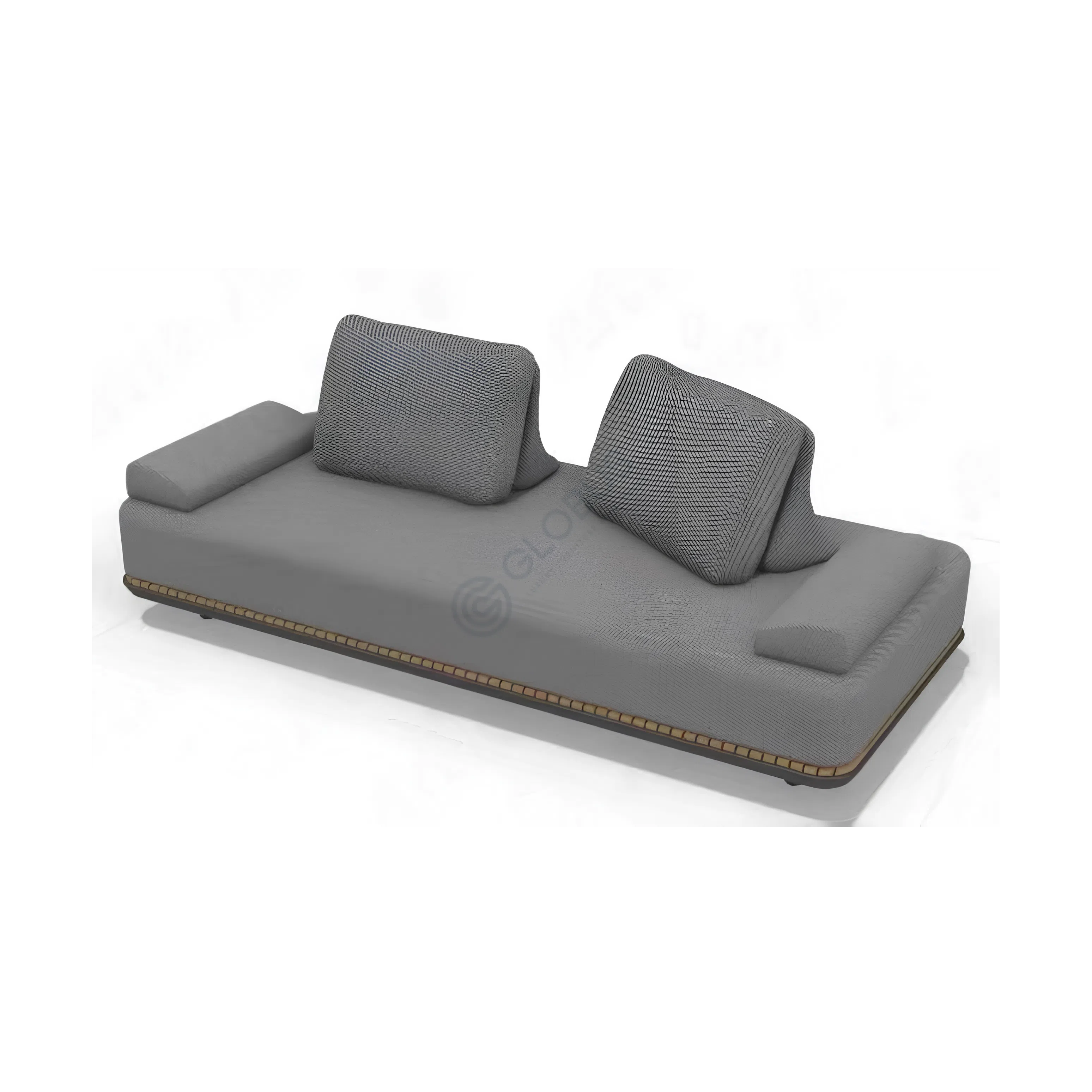 Crafted from durable aluminum, the frame provides robust stability while remaining resistant to the elements. The seating surfaces are covered in a specially selected textile, chosen for its comfort and suitability for outdoor environments. The base is finished with polywood detailing, offering a warm, natural aesthetic that contrasts elegantly with the modern structure and provides lasting quality for exterior placement.