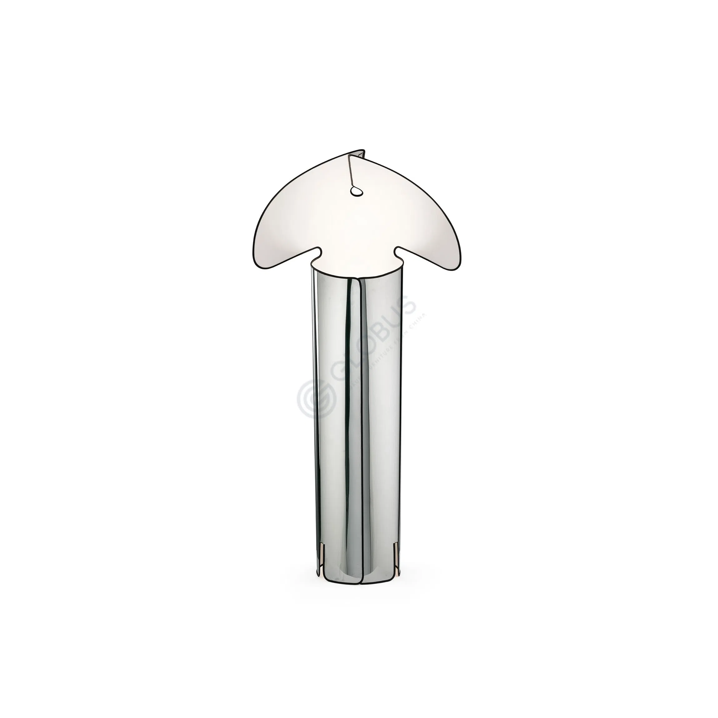 Above the cylindrical base sits a distinctly shaped shade, designed to softly diffuse the light. This unique element curves gently, directing illumination while adding a sculptural quality to the piece.