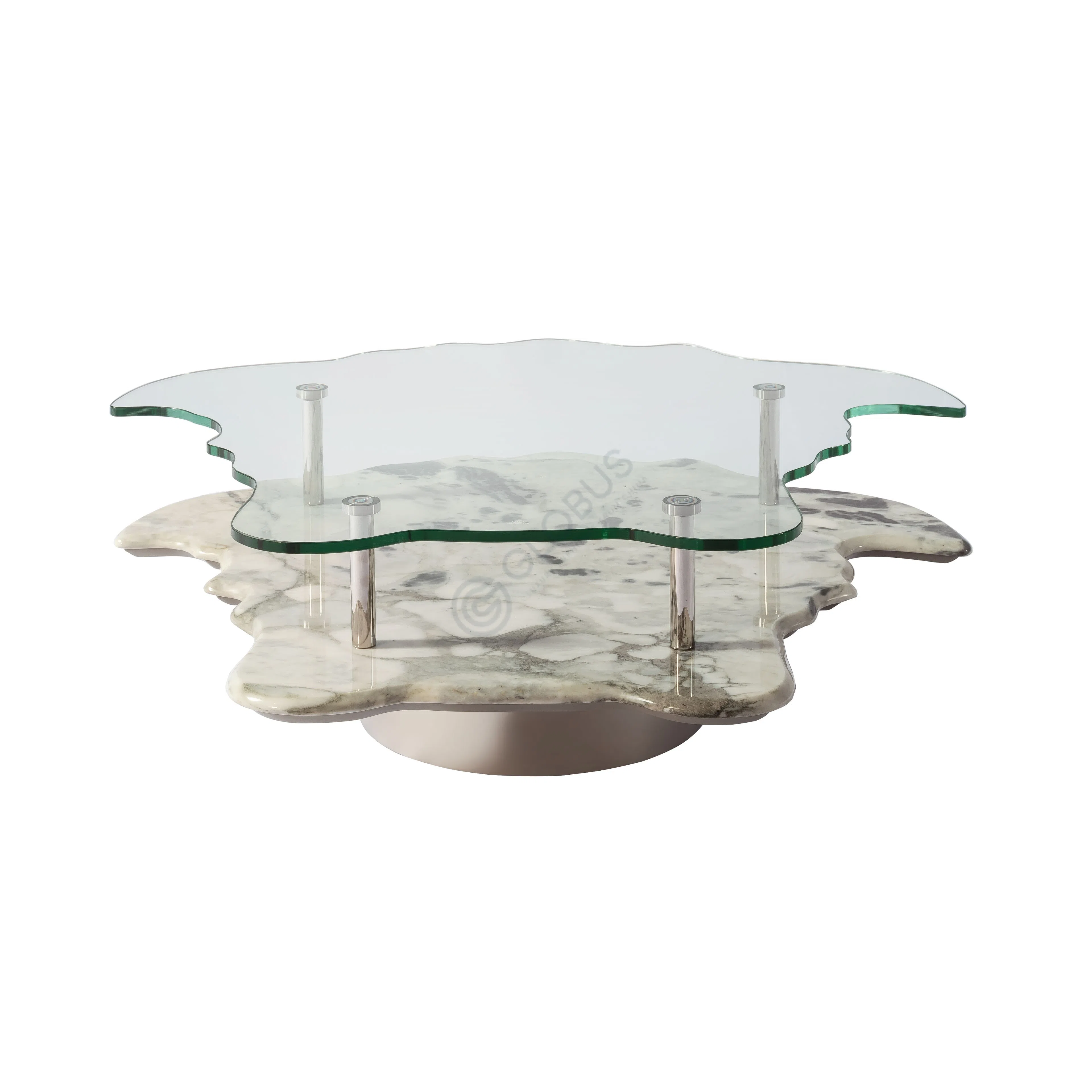 The design features a uniquely shaped tempered glass top, offering a light and transparent surface. Below, a layer of natural marble with an irregular, flowing edge rests above a solid, cylindrical stainless steel base. Slender steel columns connect the glass top to the marble layer, creating an interesting interplay of levels and textures.