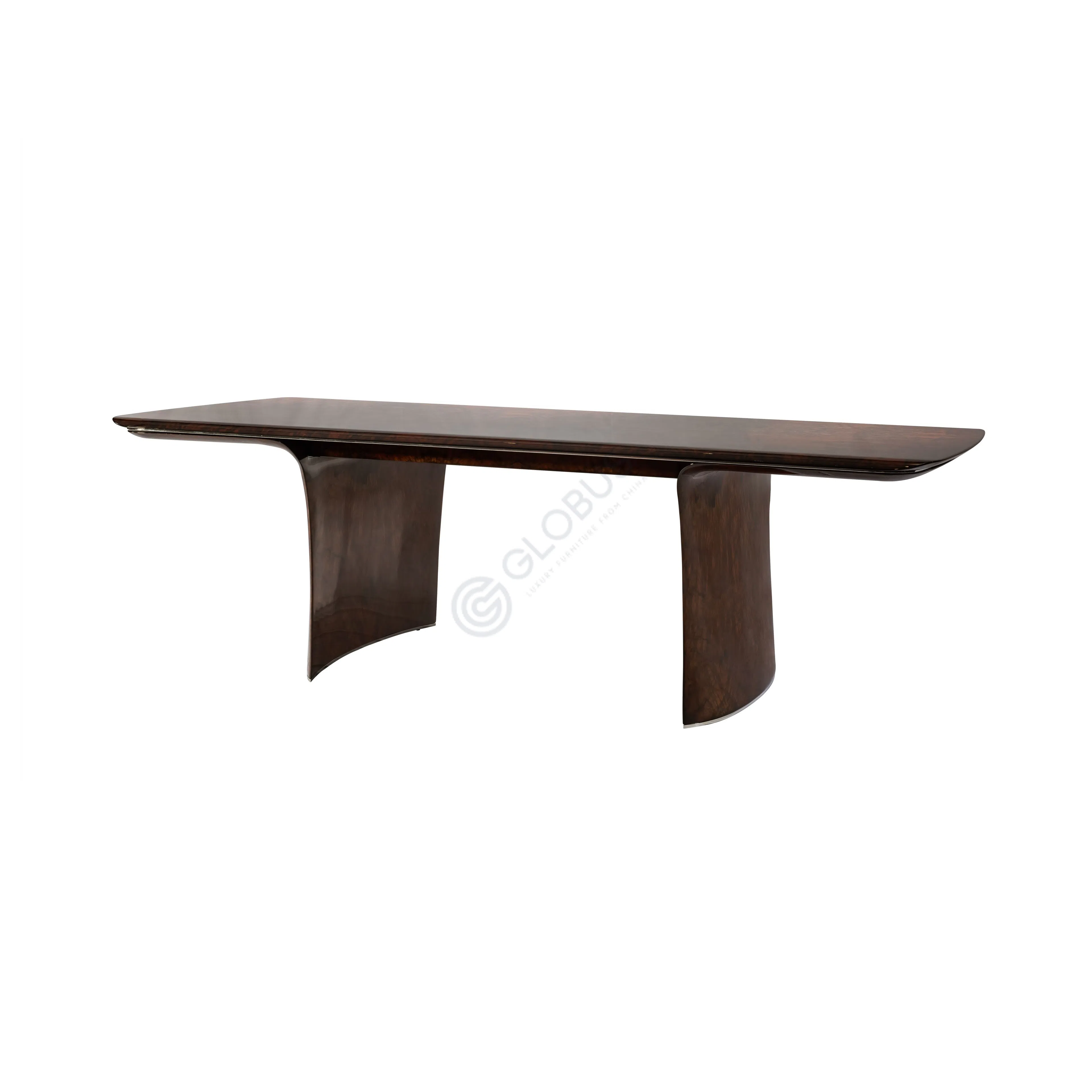 The table is supported by two substantial, curved legs that provide a strong, sculptural foundation. Crafted from a combination of solid wood, plywood, and possibly internal metal structure, these supports are finished with a smooth, dark lacquer complementing the richness of the tabletop. Their flowing shape adds a sense of contemporary elegance.