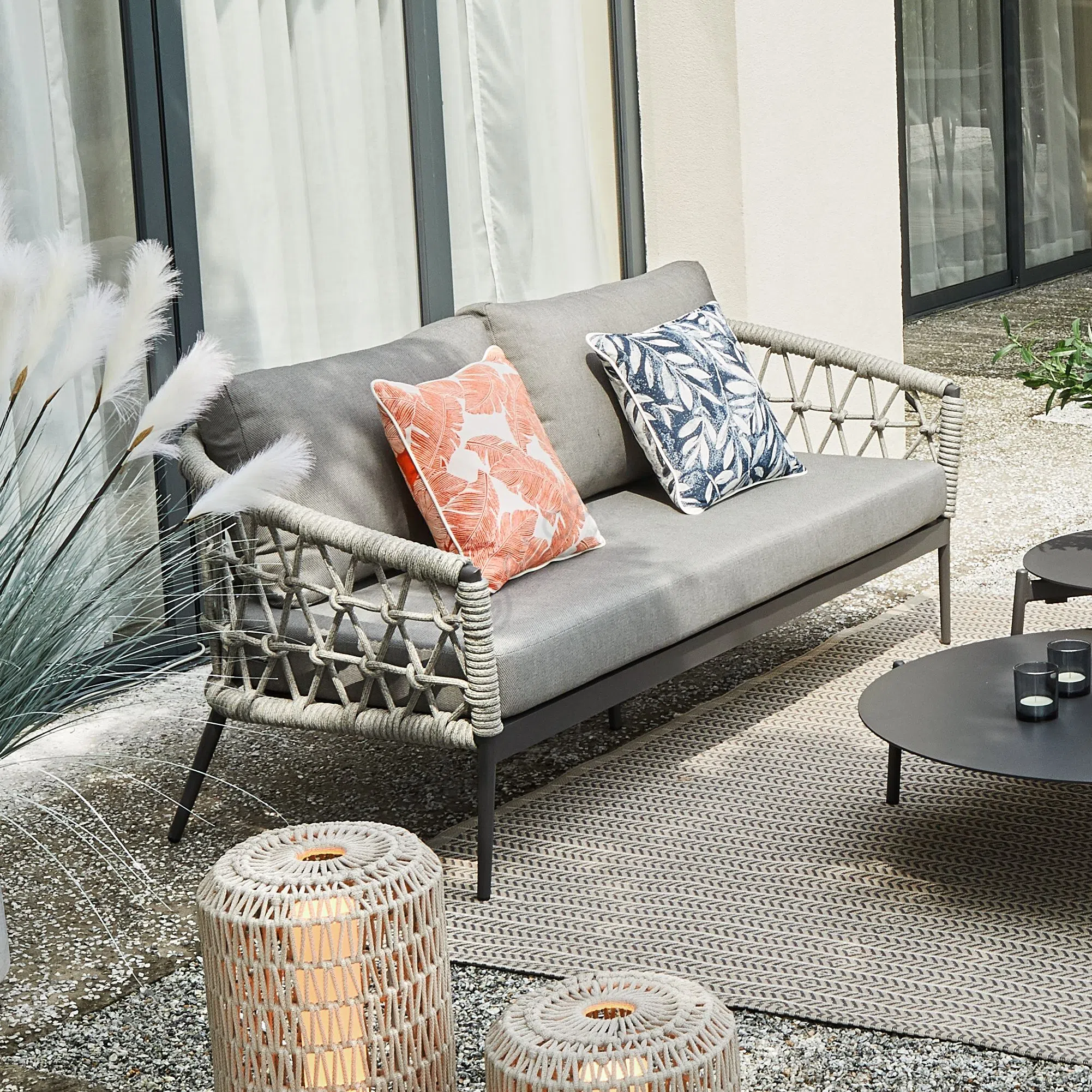 Deep textile cushions enhance the comfort, inviting you to settle in. The seat cushion and supportive back cushion, complemented by a decorative throw pillow, create a plush and comfortable spot to unwind outdoors.