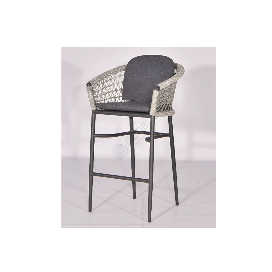 The armchair is constructed using durable materials suited for outdoor use. A robust aluminum frame provides a stable foundation, while the armrests and back feature an intricate weaving of synthetic rattan, adding both elegance and texture to the design.