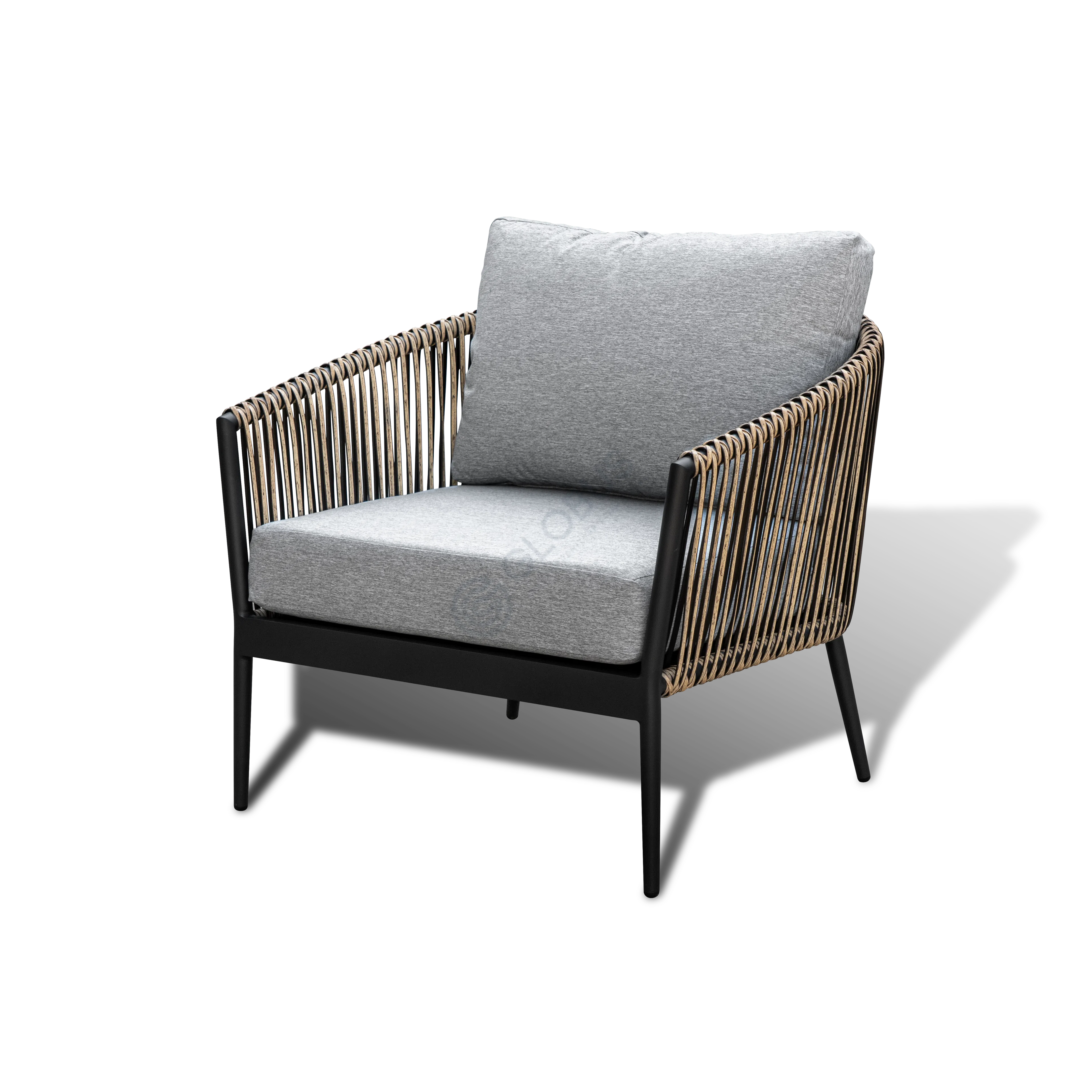 This modern outdoor chair presents a clean, inviting design. It features a sturdy aluminum frame that forms the base and structure, ensuring durability for exterior use.