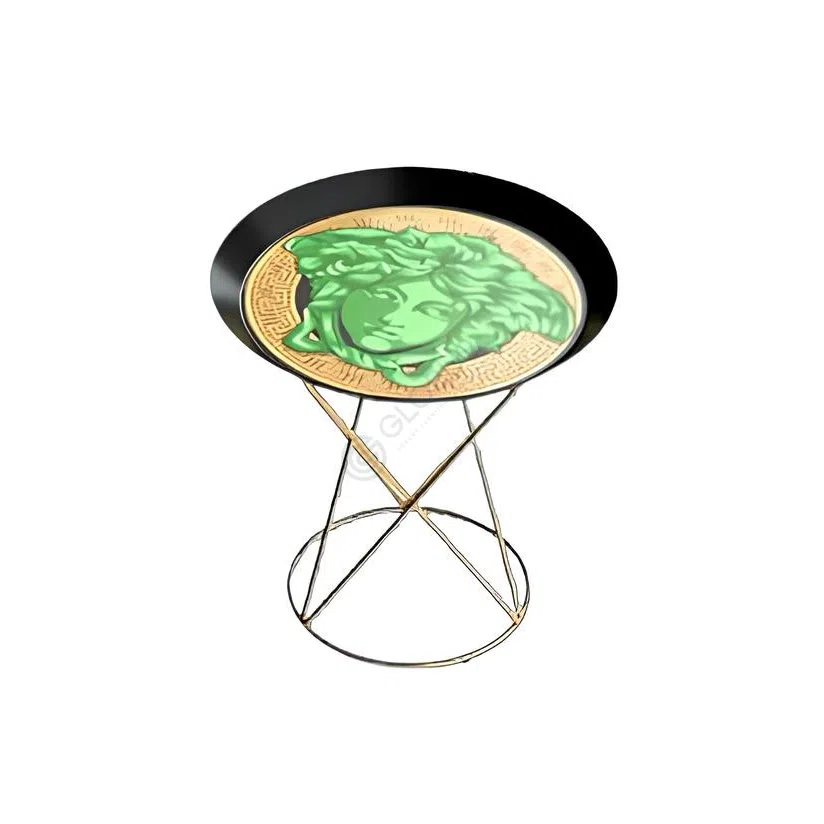 The table is supported by a minimalist metal base with a refined finish. The base structure is designed for stability while maintaining a light and elegant aesthetic, complementing the unique top design. Its modern style makes it a fitting addition to contemporary living spaces.