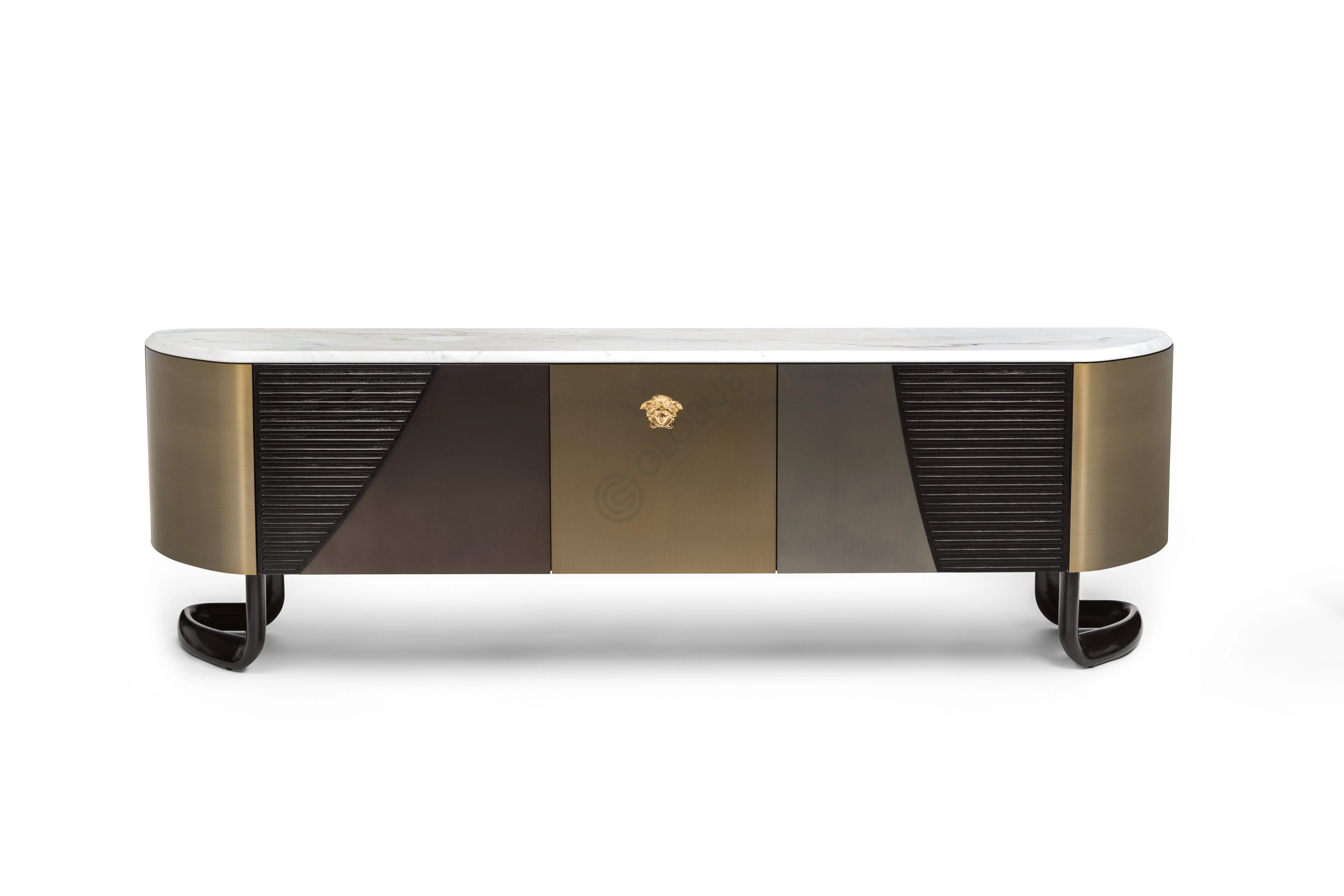 Functionality is seamlessly blended into the design, with integrated storage options including a convenient drawer built into the desktop area and a compact, curved storage unit on the side, offering discreet organization. This piece is a focal point, combining beautiful design with practical use for an elevated home office environment.