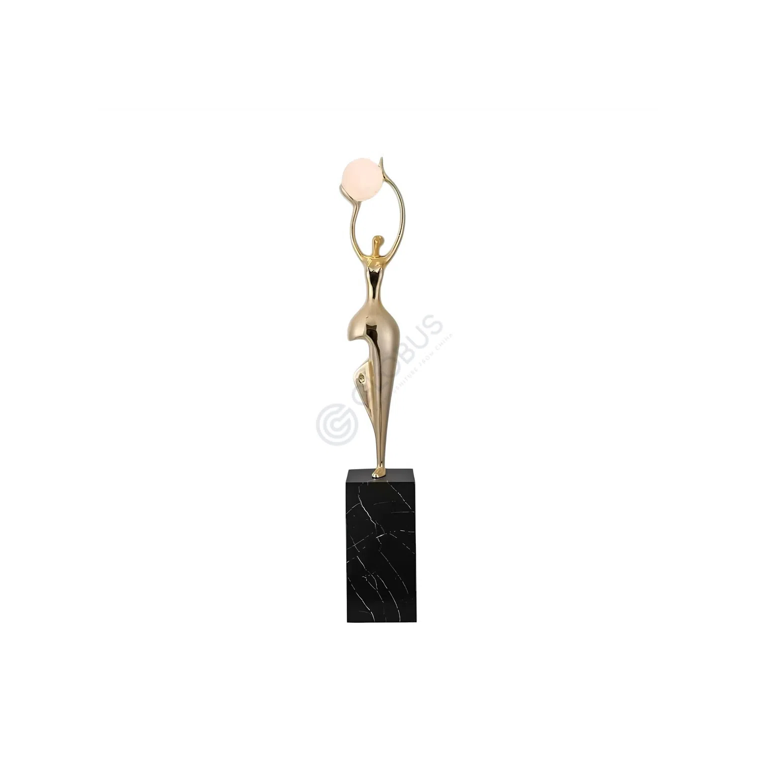 A modern floor lamp that stands as a sculptural presence, this piece features an elegant, figure-like silhouette that brings a sense of movement and artistry to a room. Its form gracefully curves upwards, culminating in an integrated light element held overhead.