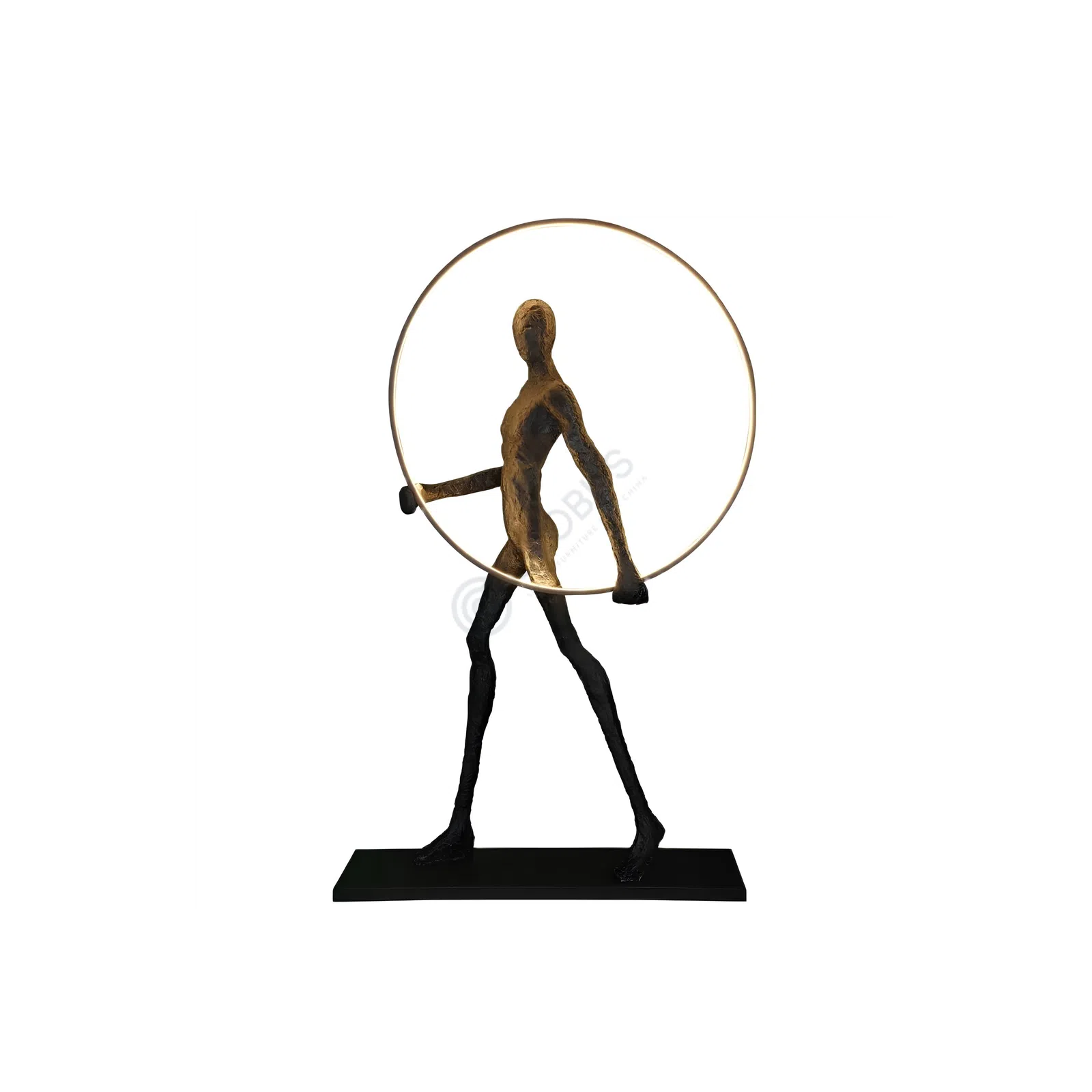 This striking floor lamp presents itself as a piece of modern sculpture, depicting an elongated figure in motion. The artistic design captures a sense of movement and purpose, rendering the human form in a dynamic pose. Crafted from durable fiberglass, the figure exhibits a textured finish, suggesting depth and character in its material.