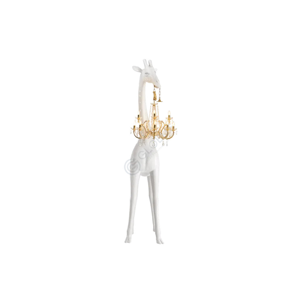 This distinct wall lamp features a beautifully crafted white giraffe form, holding a classic miniature chandelier. The main body is expertly fashioned from durable fiberglass, presenting a smooth, matte finish that highlights its sculptural quality.
