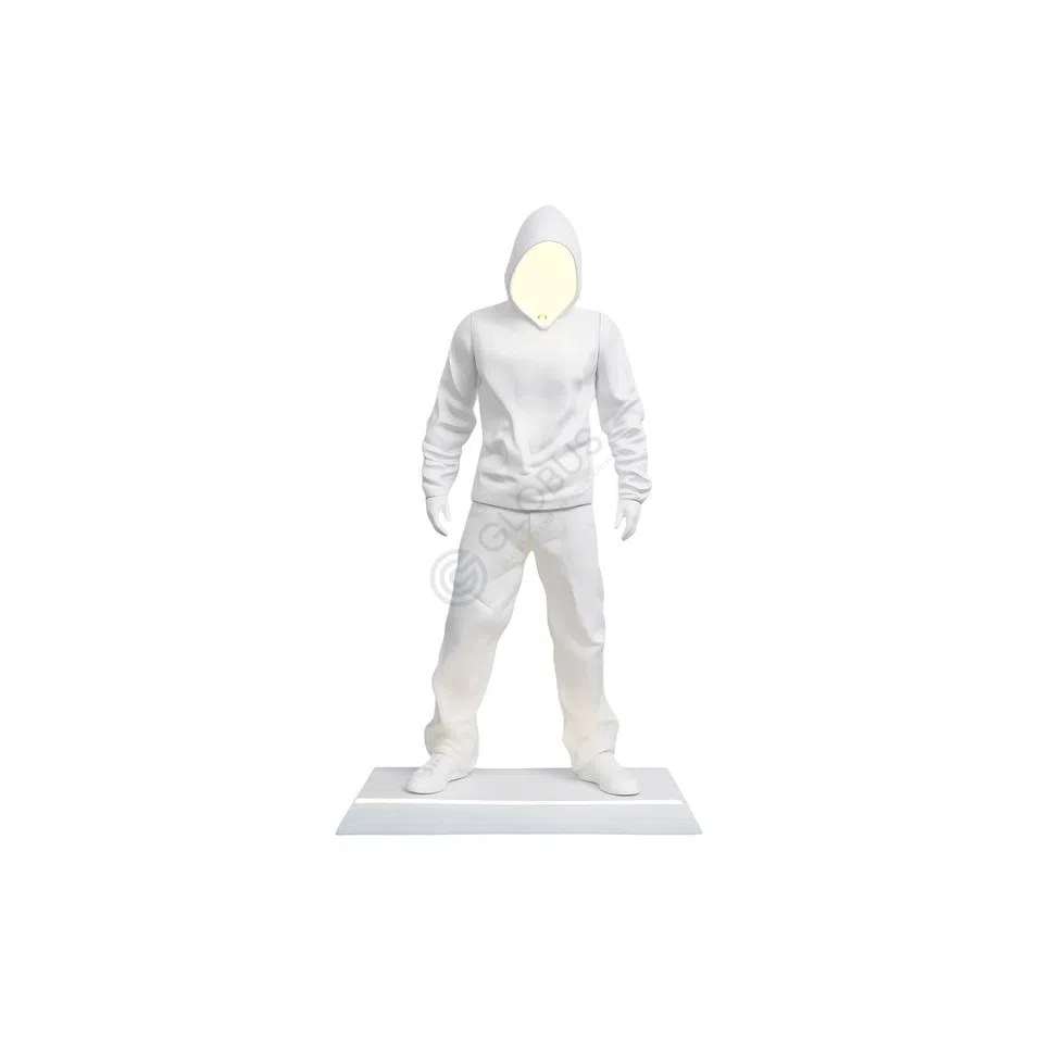 Introducing a contemporary floor lamp crafted from durable fiberglass. This sculptural piece features a unique design depicting a seated figure in a relaxed pose, wearing a hooded garment. The clean, white finish and flowing lines offer a distinctly modern aesthetic, turning illumination into a captivating form.
