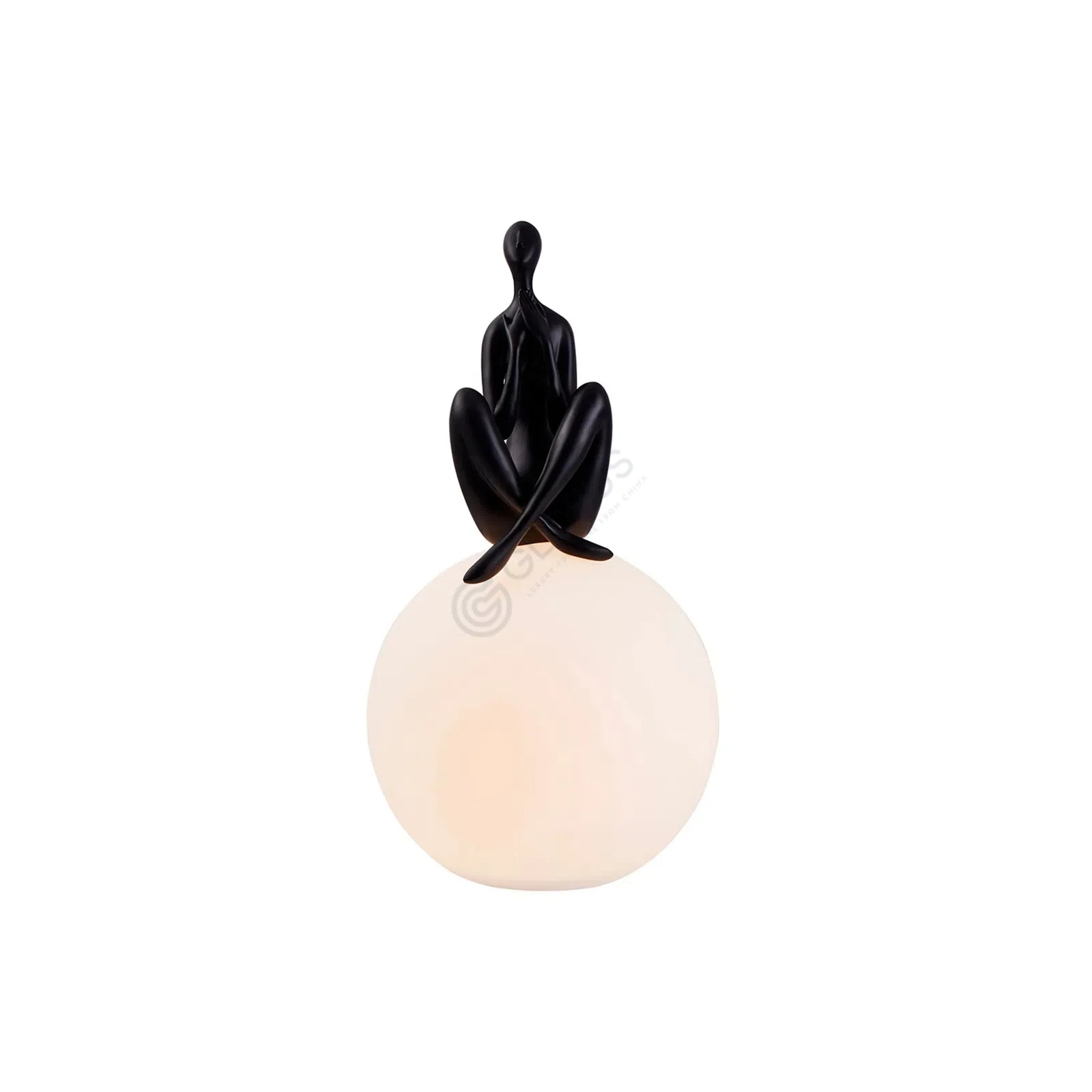 This table lamp presents a striking modern design that doubles as a piece of sculptural art. A vibrant red figure, crafted with smooth lines, is poised thoughtfully atop a large, diffused white sphere. The pose of the figure conveys a sense of contemplation or serene rest, adding a narrative touch to the piece.