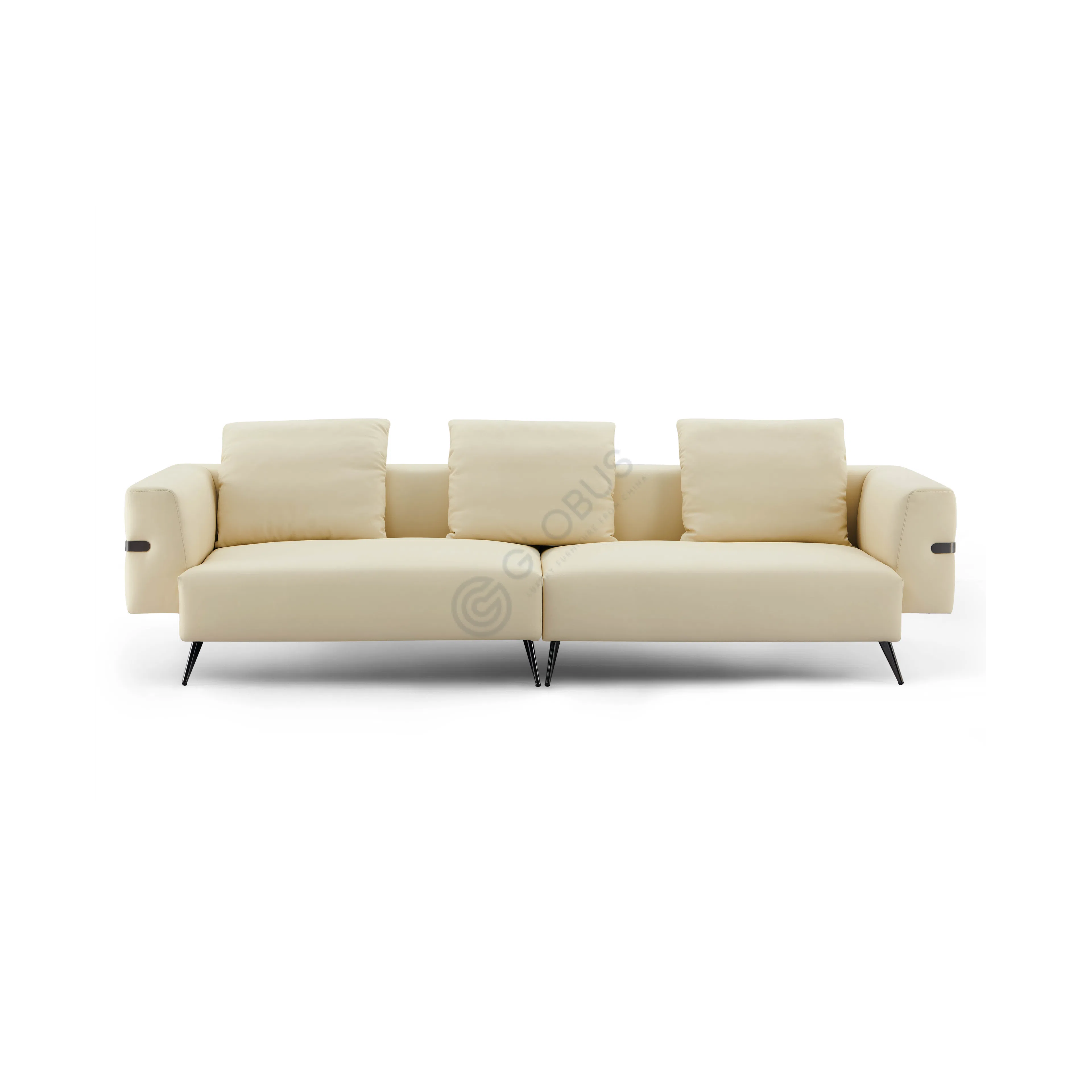 Constructed with a solid wood and plywood internal frame, this piece is built for stability and longevity. It rests on slender stainless steel legs that provide robust support and enhance the light, airy feel of the design. A subtle stainless steel band detail along the base adds a refined accent to the chair's structure.