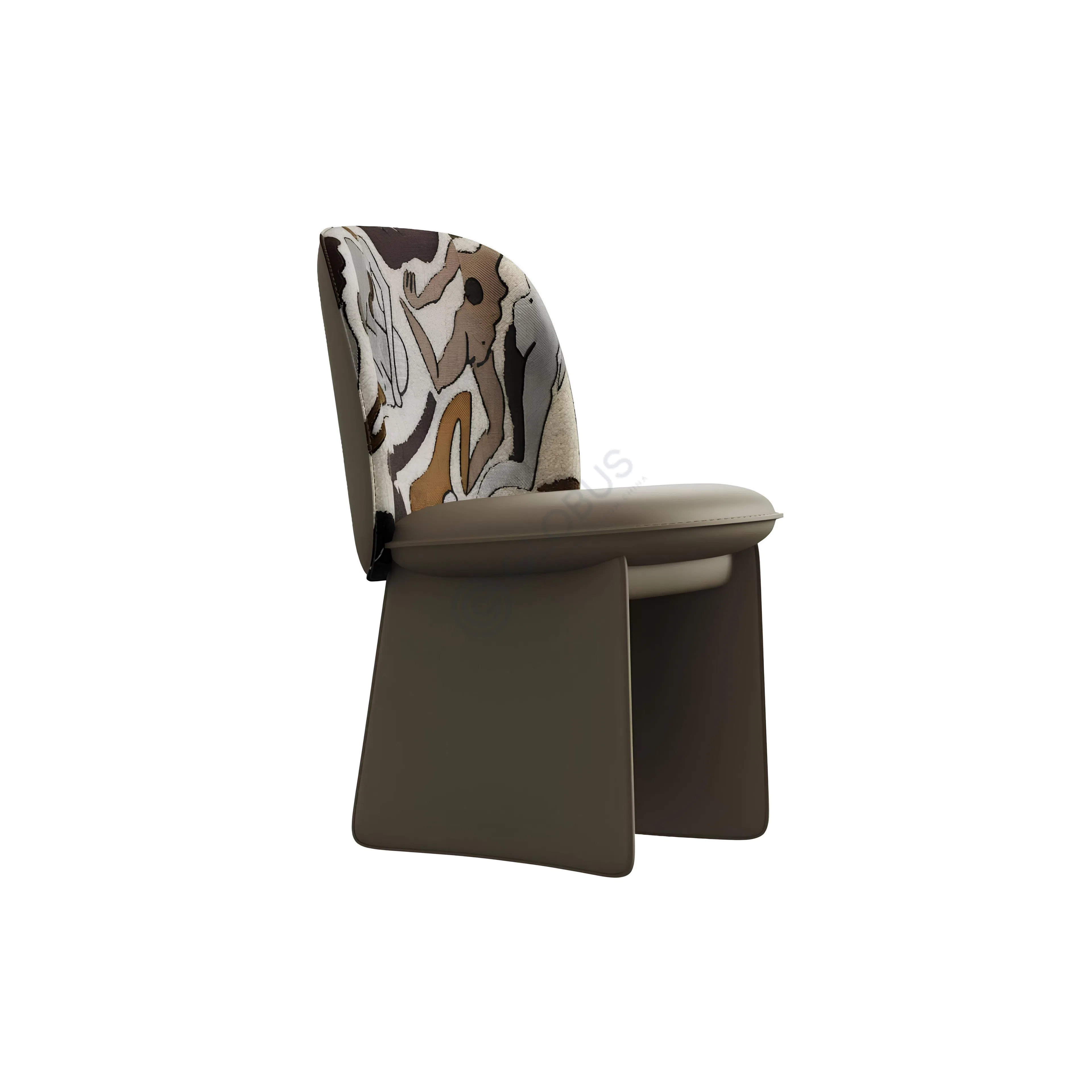 The generously cushioned seat and curved backrest are upholstered in a smooth textile material, complemented by an artistic pattern on the backrest that adds character to your dining room or kitchen. The muted brown tones of the base integrate beautifully with the vibrant design, creating a harmonious blend of style and functionality.