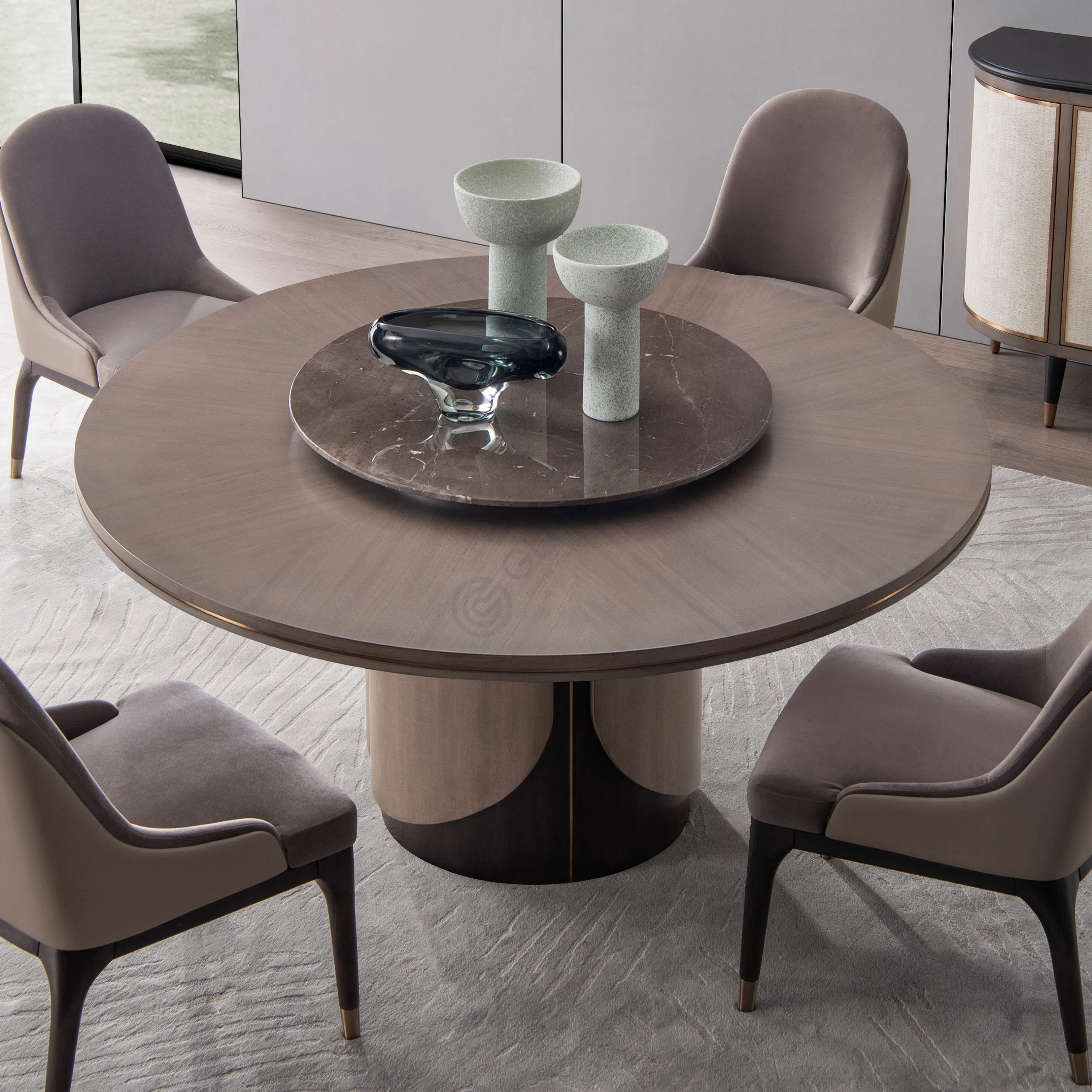 The circular tabletop rests on a sturdy, curved plywood base, blending structural strength with an artistic element. Finished with refined detailing, the table features subtle contrasts between the dark wood tones and the soft metallic trim, enhancing its aesthetic appeal while maintaining balance in style.