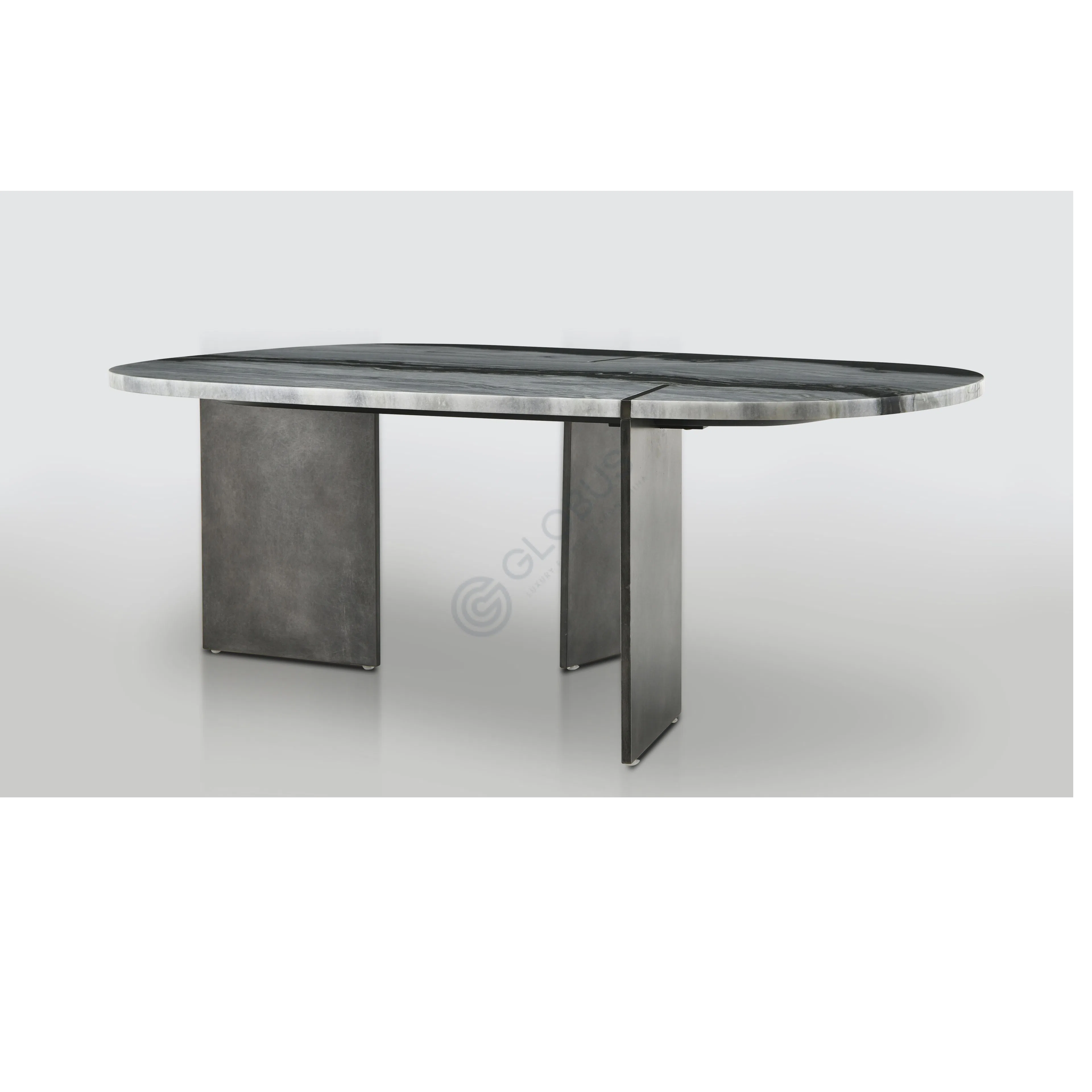 The base is crafted from stainless steel, forming a distinctive and sturdy support. Its linear elements provide a clean and contemporary aesthetic that complements the luxurious feel of the marble. The combination of these materials creates a balance of enduring beauty and modern form.