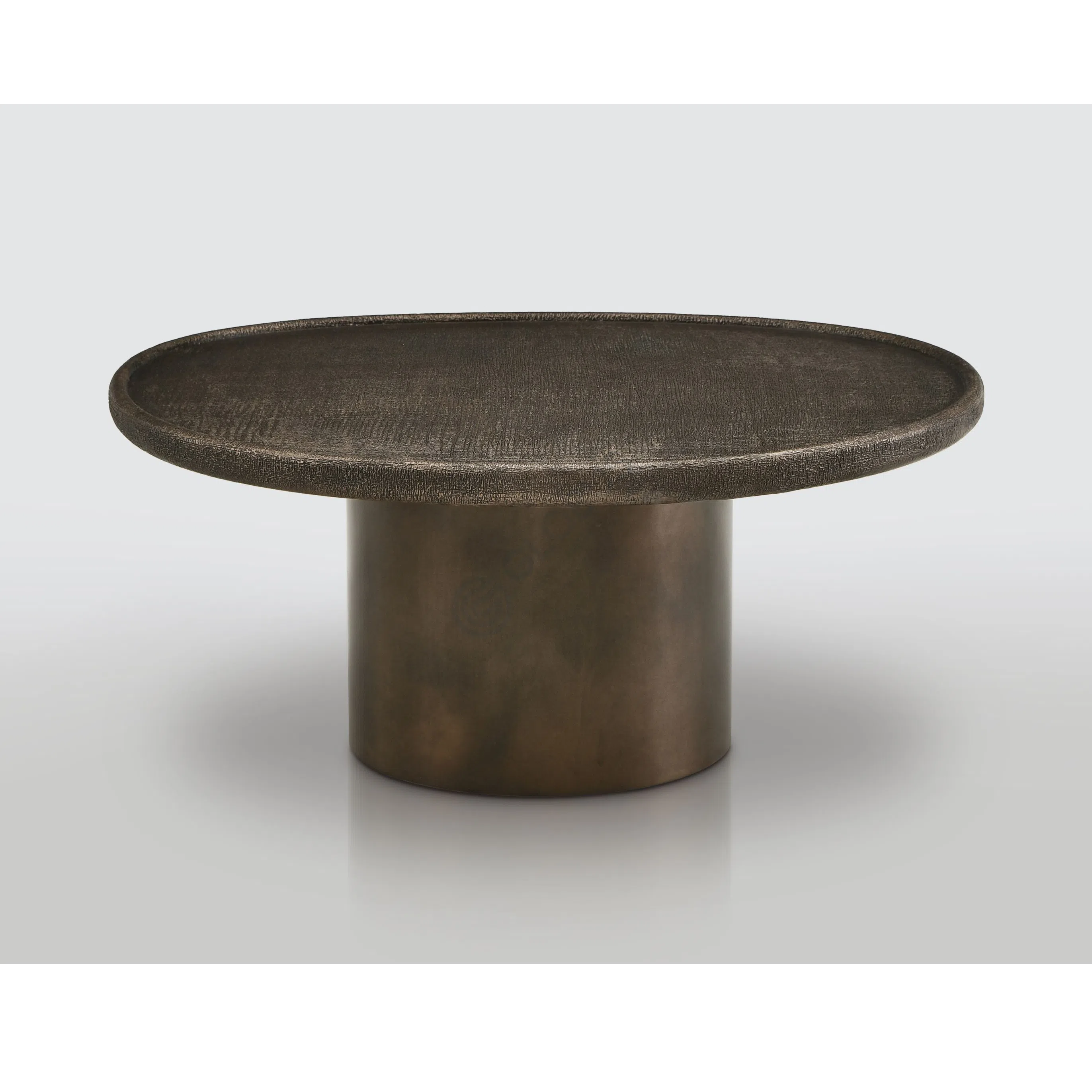 This side table presents a distinctive form, featuring a clean cylindrical pedestal base topped with a substantial round surface. Its finish offers a rich, aged texture in a warm metallic tone.