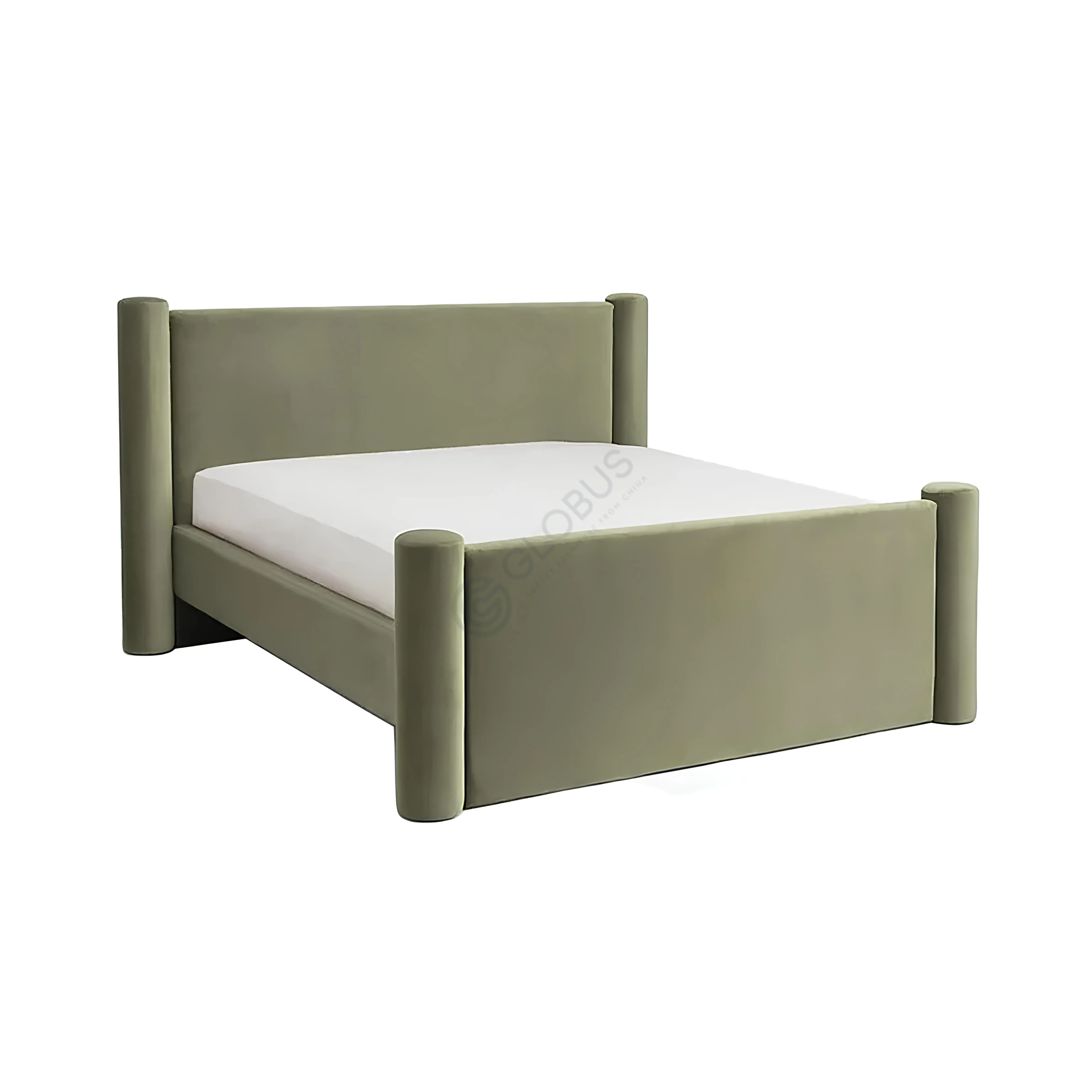The bed frame and headboard are fully upholstered, offering a soft, tactile finish. A distinctive feature is the presence of substantial, rounded posts at each corner, providing a visual anchor and soft form to the overall structure. The headboard is simply shaped, designed to offer comfortable support.