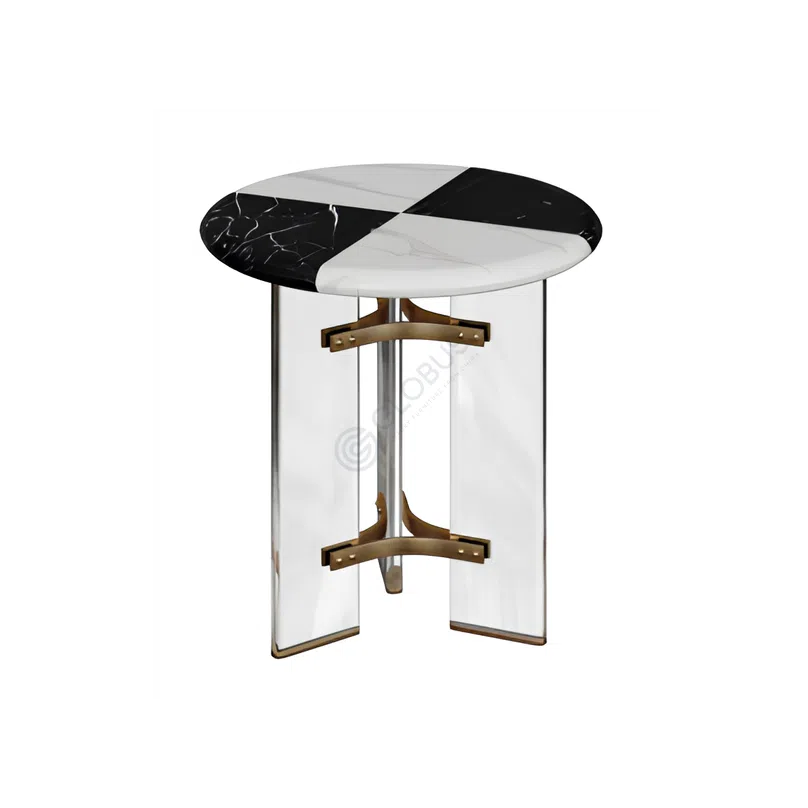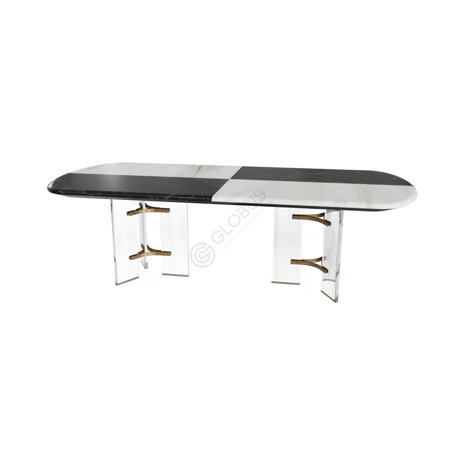 The base combines clear acrylic legs with a polished stainless steel structure. The transparent acrylic provides a sense of lightness, allowing the design to appear open and airy. An elegant, curved support fashioned from stainless steel with a gold-tone finish adds a touch of sophistication and stability, connecting the elements beautifully.