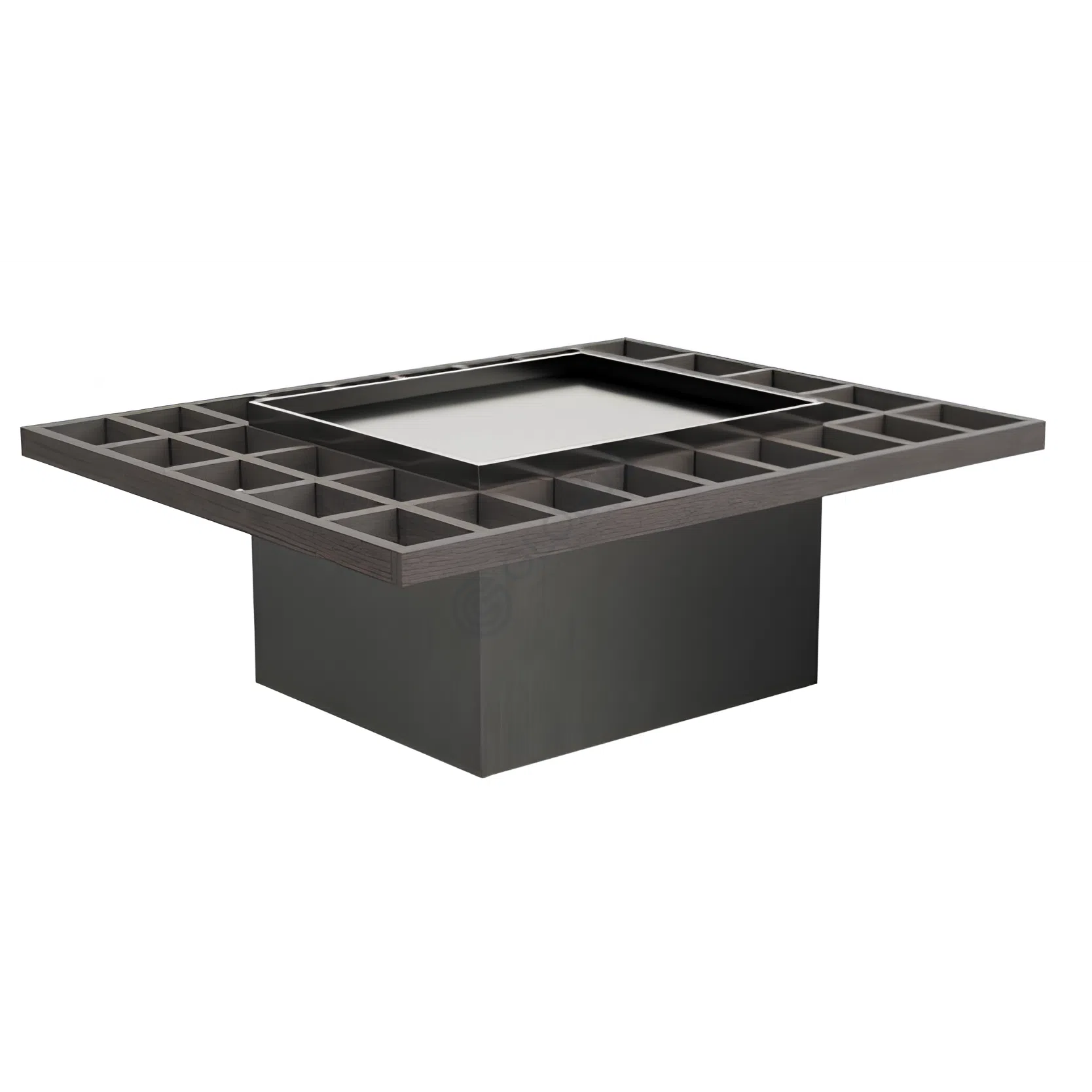Constructed from solid wood, the base ensures stability and provides a substantial presence. The intricate grid tabletop and the integrated tray utilize solid wood thoughtfully combined with stainless steel, contributing to a durable and sleek finish that highlights the piece's modern aesthetic.