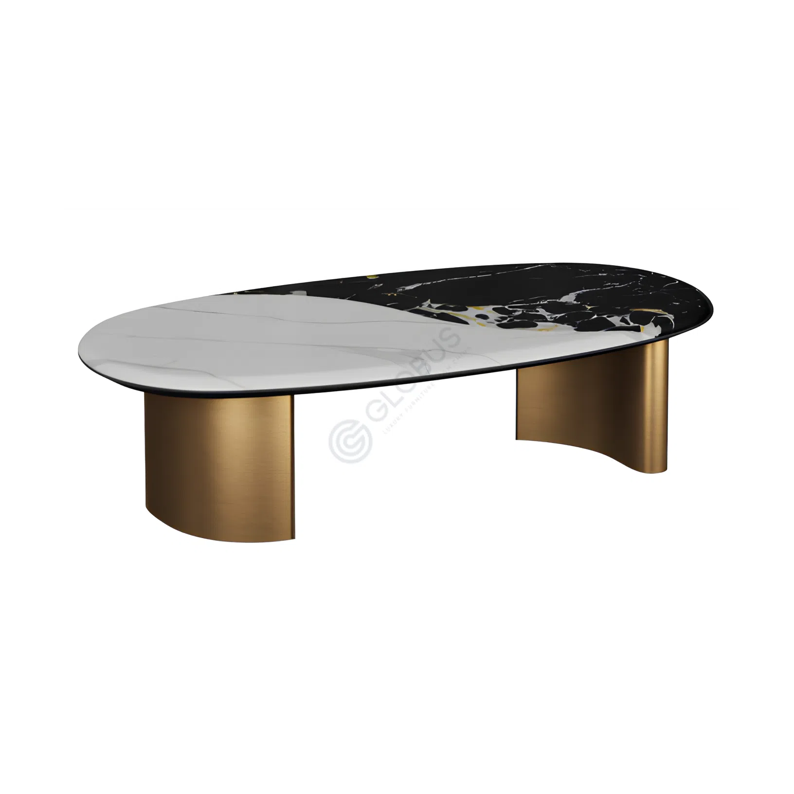 This dining table presents a striking modern design, centered around a unique oval top crafted from natural marble. The surface features a distinctive split, seamlessly combining dark and light marble sections with their inherent veining, creating a visually dynamic pattern across the tabletop. This use of natural stone highlights both elegance and individual character, as no two marble pieces are exactly alike.