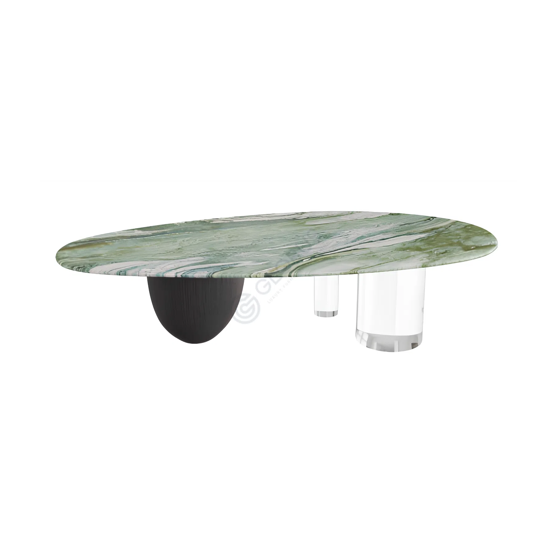 The table stands on two distinct legs, creating a dynamic visual balance. One leg is a solid, sculptural form, while the other is a clear acrylic cylinder with a refined base detail. This interplay of opaque and transparent, and solid and geometric shapes, underscores the table's contemporary aesthetic and highlights the thoughtful combination of materials including MDF in the base construction.