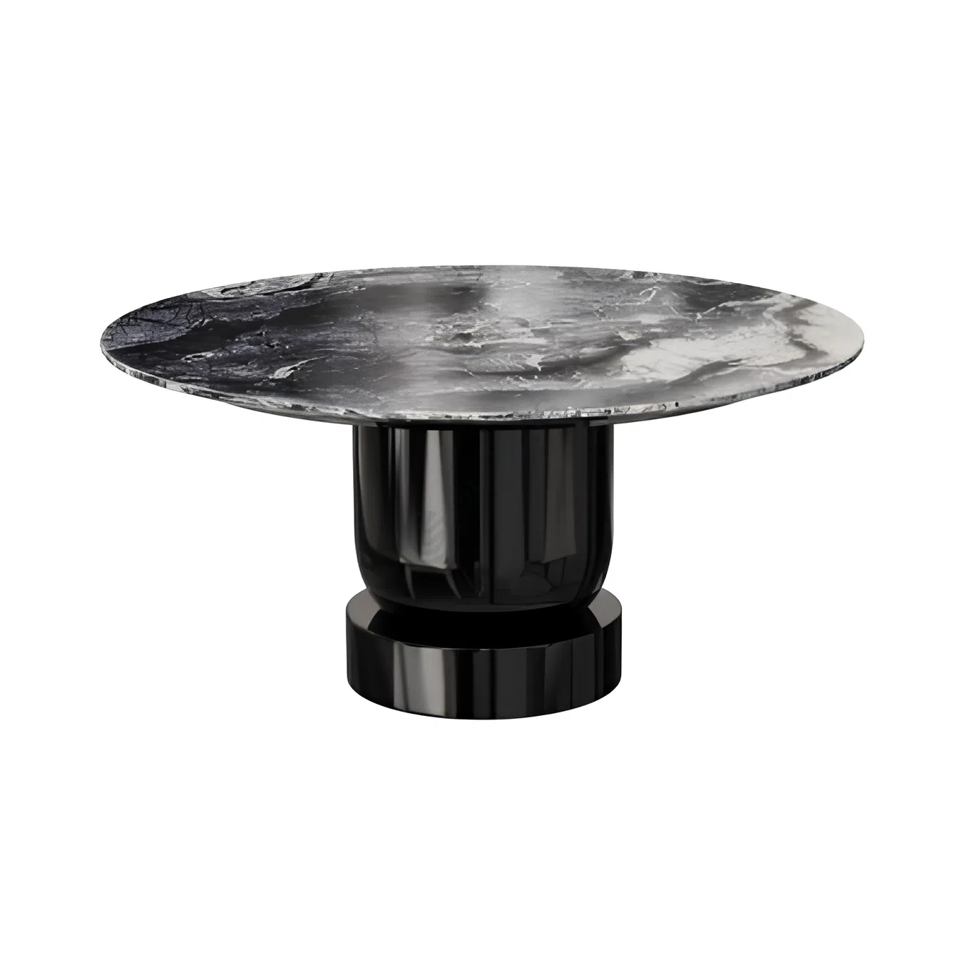 This dining table embodies modern sophistication. The contrast between the dynamic marble top and the sleek, dark base creates a powerful focal point, making it a distinguished addition to a dining room or a contemporary kitchen space.