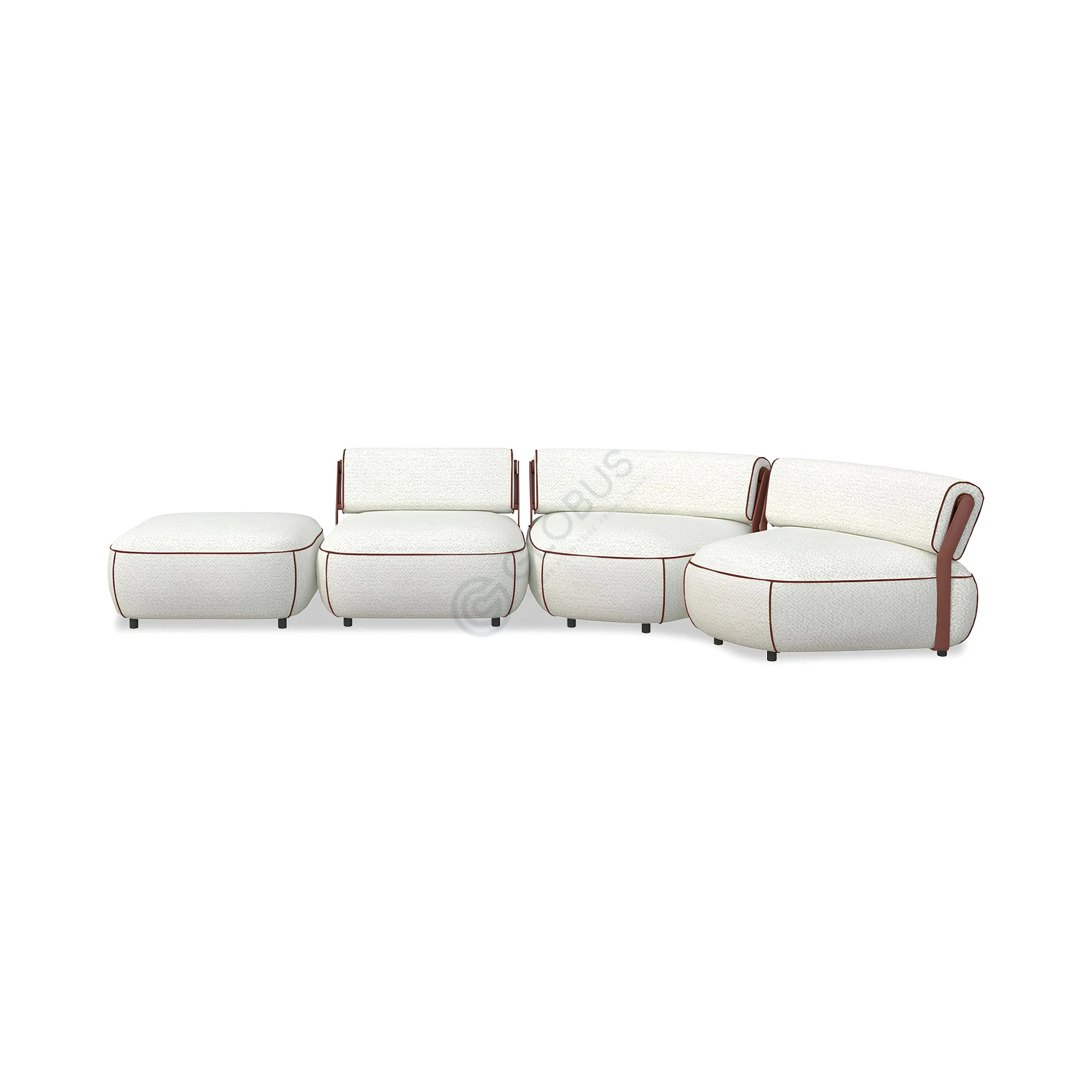 Its unique shape is built upon a sturdy framework of solid wood and plywood, subtly enhanced by stainless steel elements visible in the elegant curvature of the arm support. The plush seating is complemented by a coordinating back cushion and an accent pillow, adding both layered comfort and a subtle visual detail with its striped pattern.