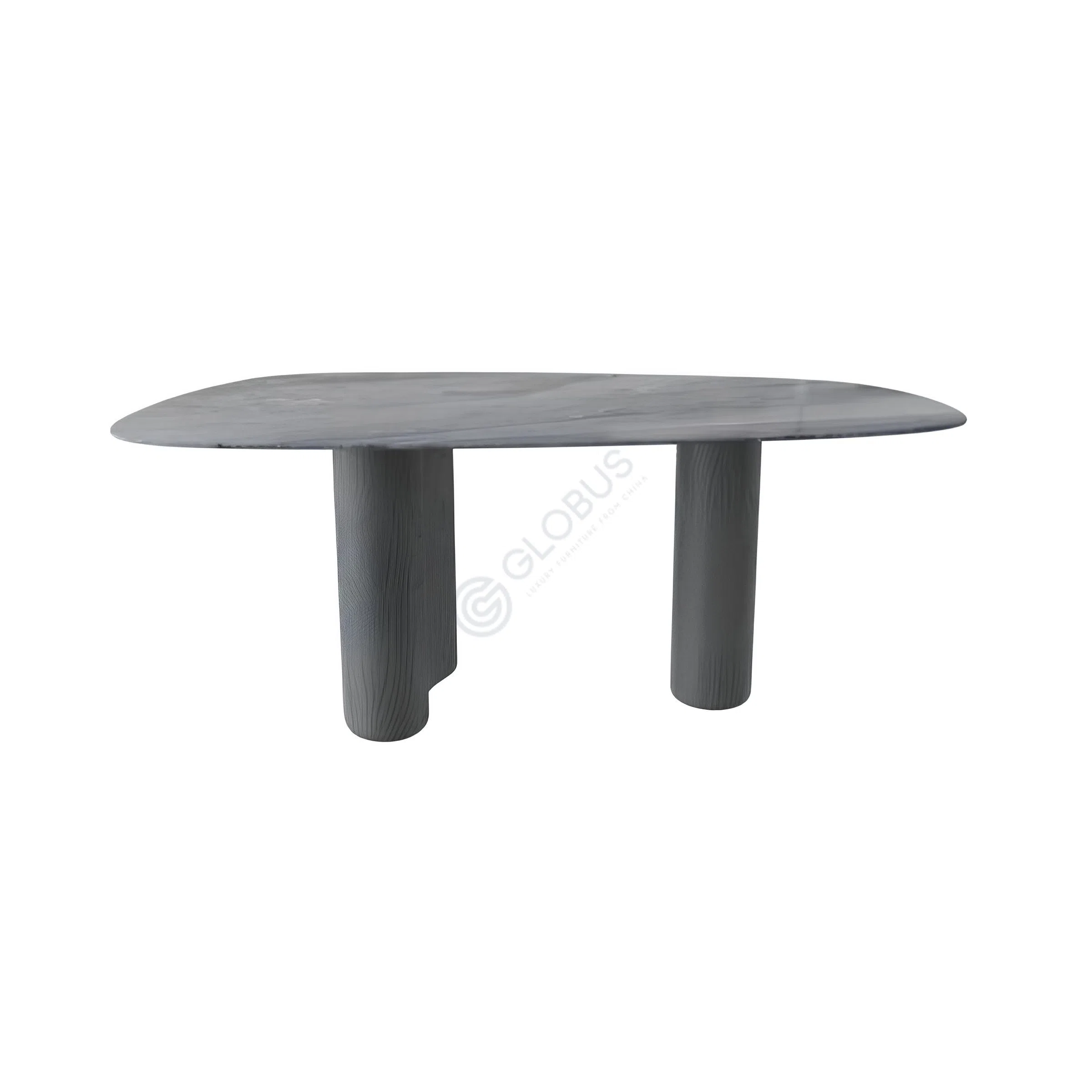 Supporting the tabletop is a distinctive base composed of solid, cylindrical elements. This foundation provides stability and contributes to the table's sculptural and grounded appearance.