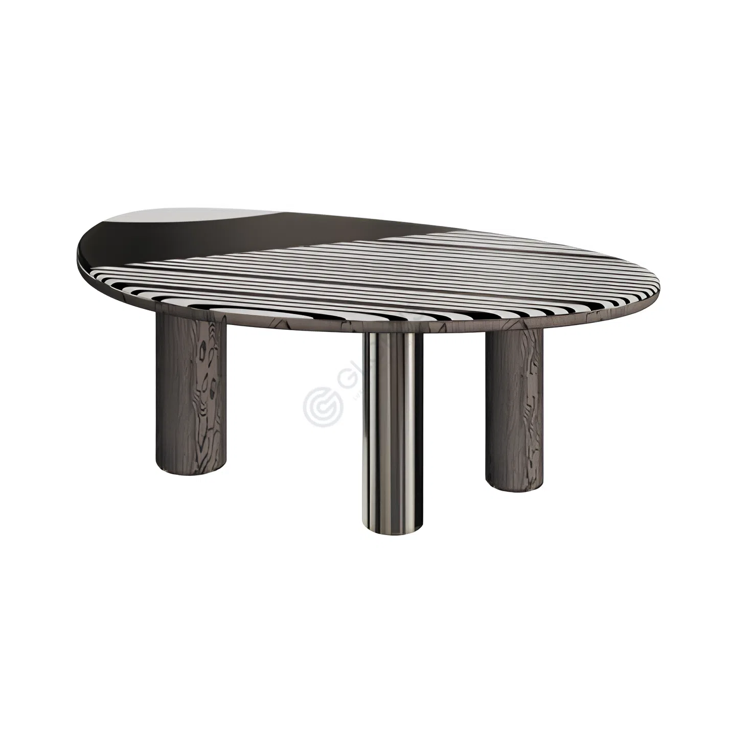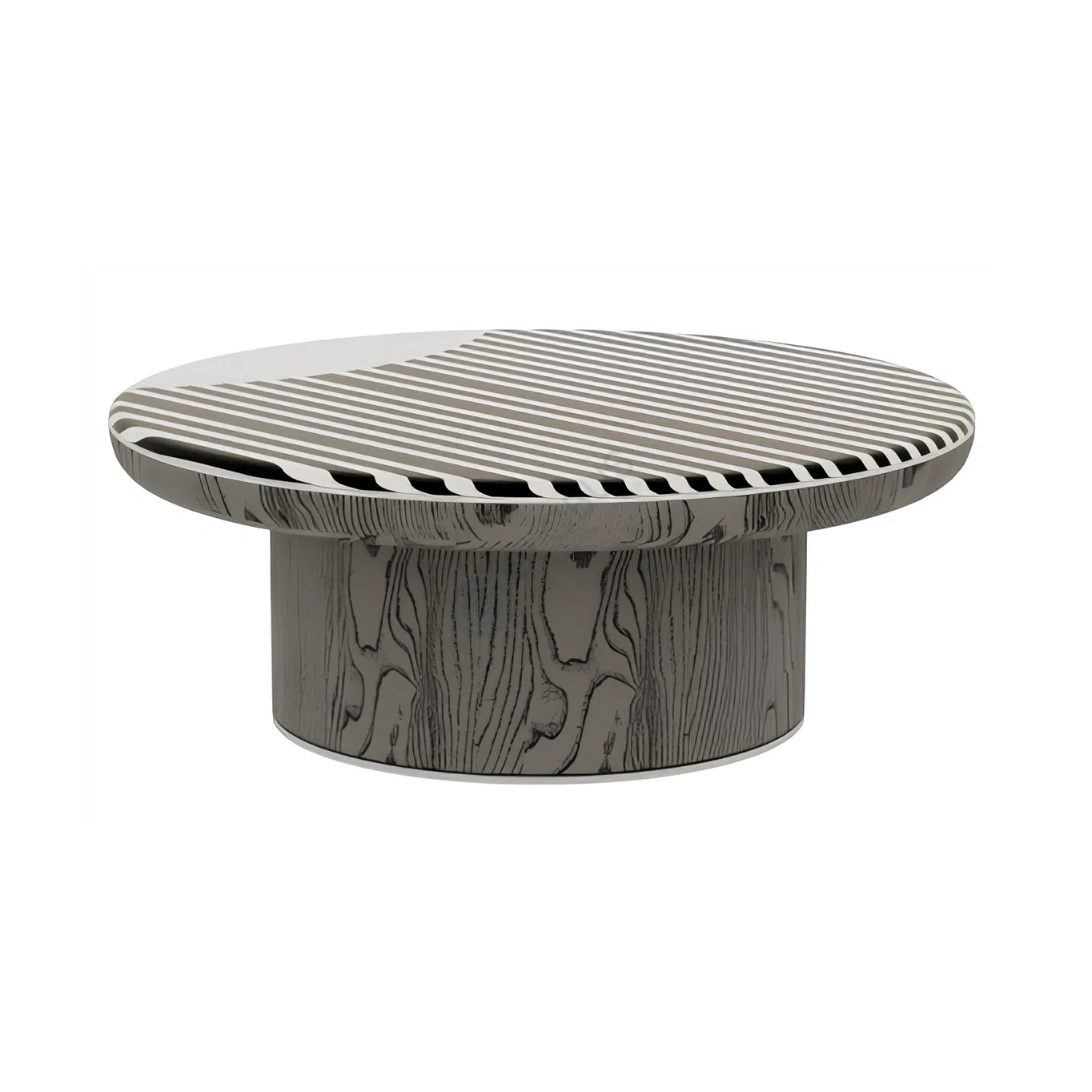 The table top is a focal point, divided visually into contrasting sections. One area offers a smooth, consistent surface, while the other displays a dynamic, fine-lined pattern that catches the eye. This layered design adds a sophisticated visual texture and intrigue, with intricate detailing visible along the edge.